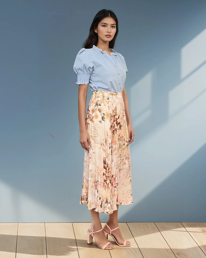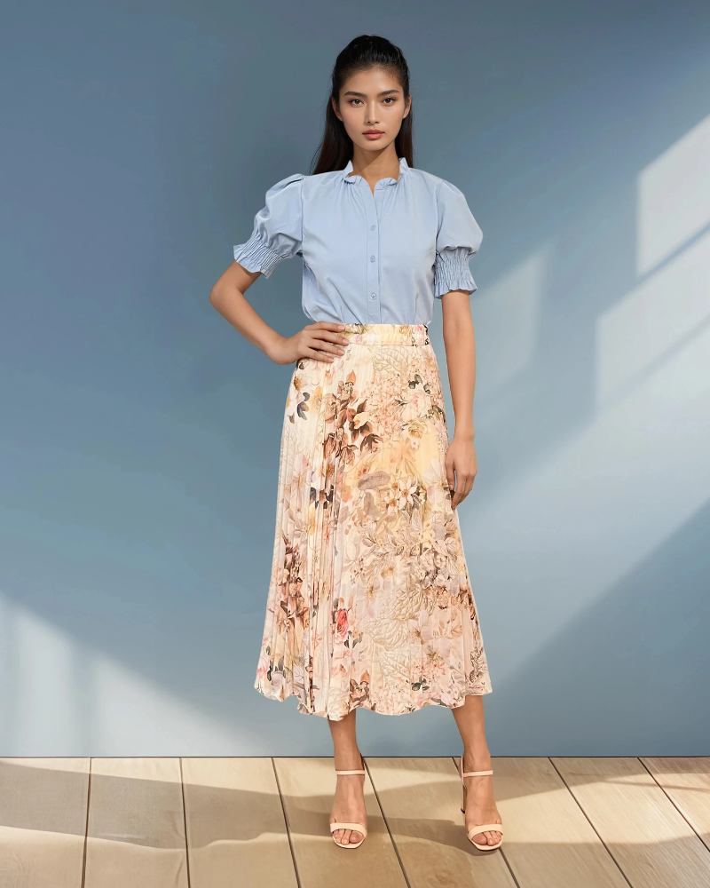 Fustă plisată lungă cu print floral crem