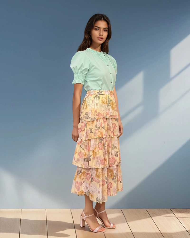 Fustă lungă cu volane și print floral galben