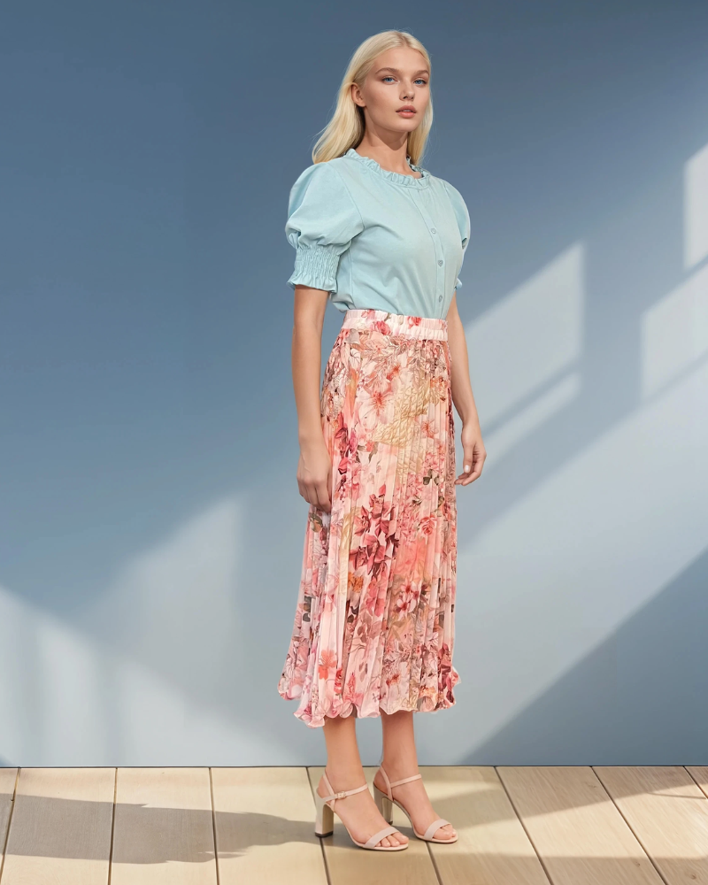 Fustă plisată lungă cu print floral roz