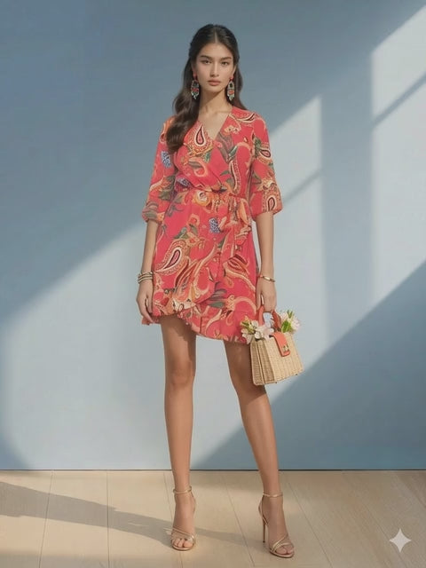 Rochie din voal cu print floral și decolteu parte peste parte roz