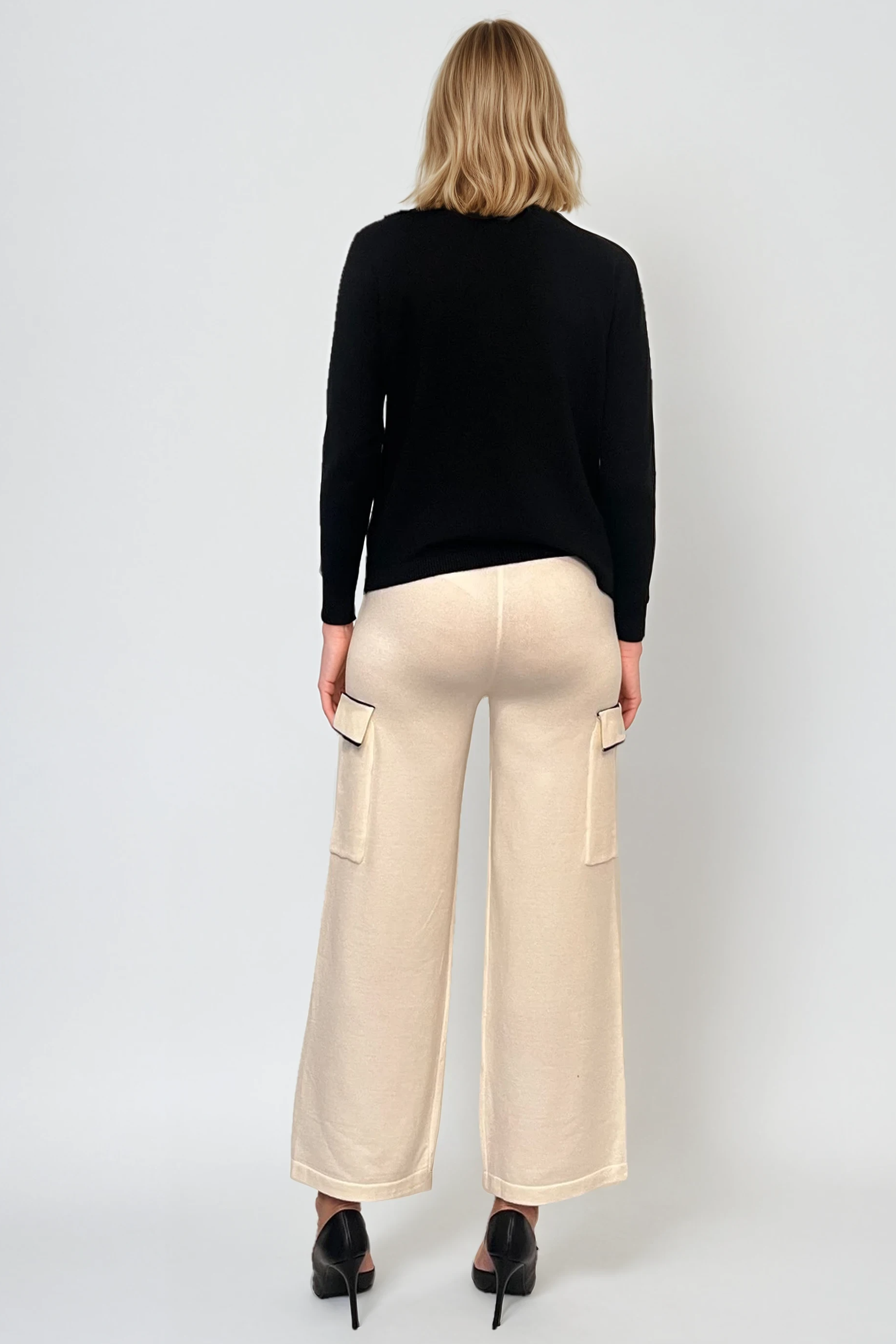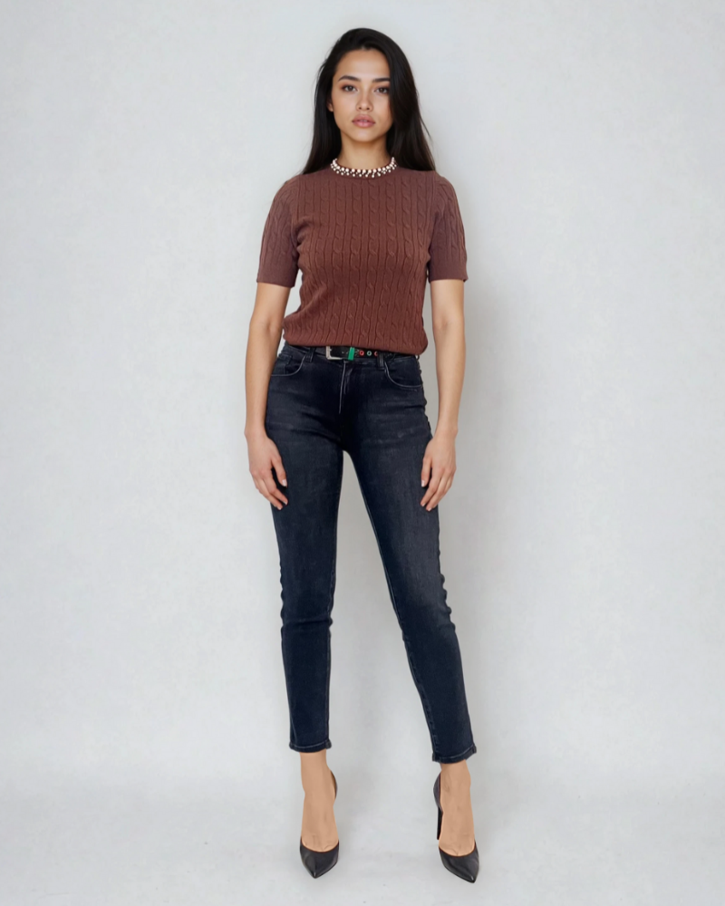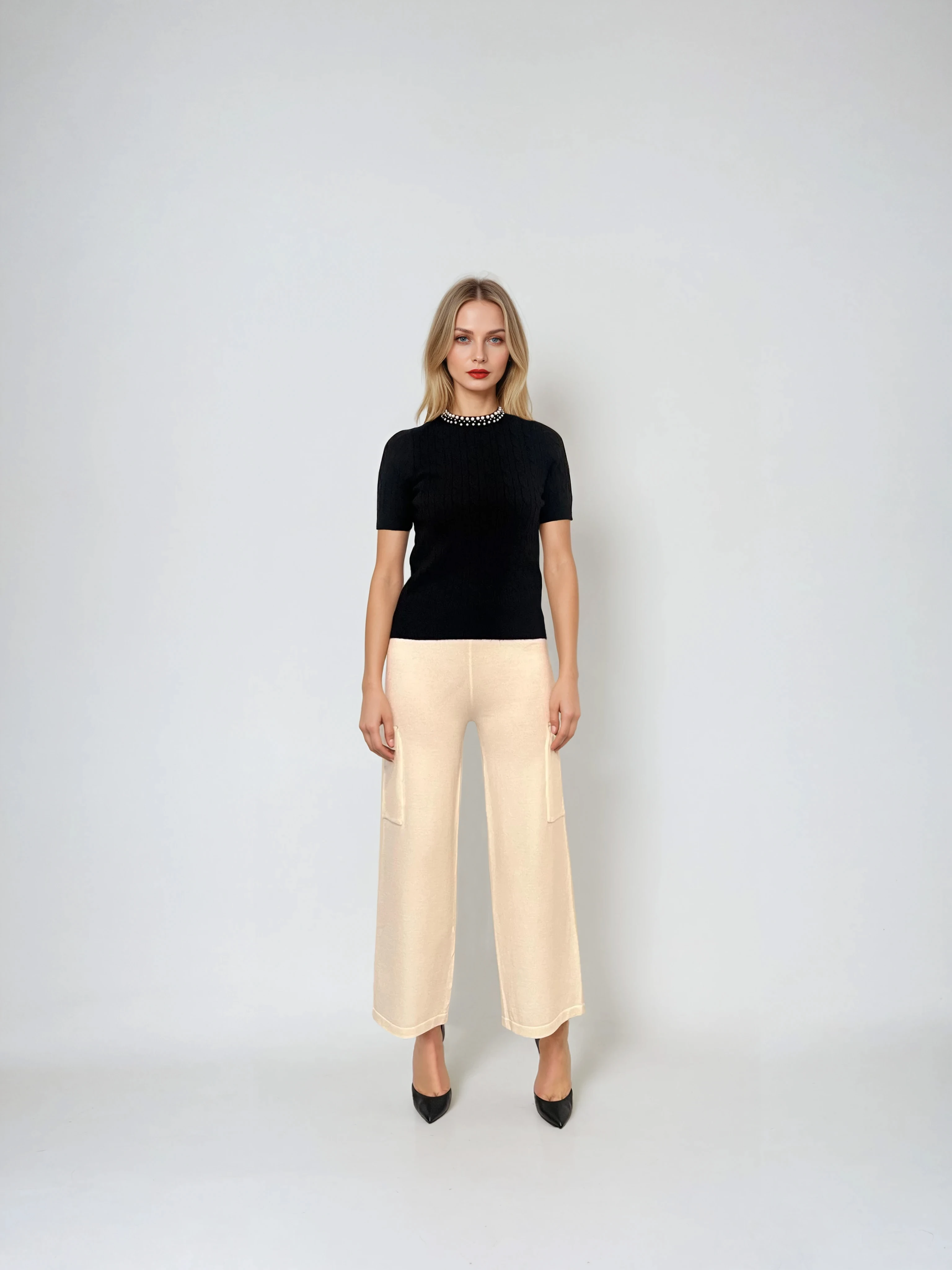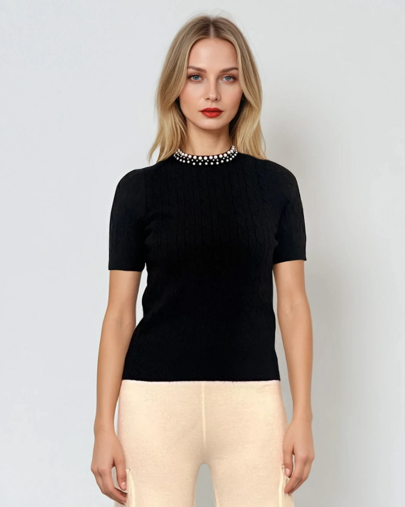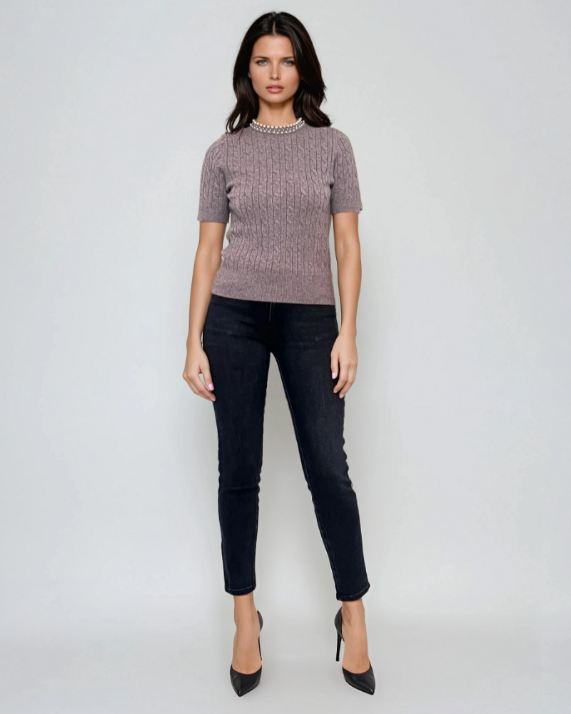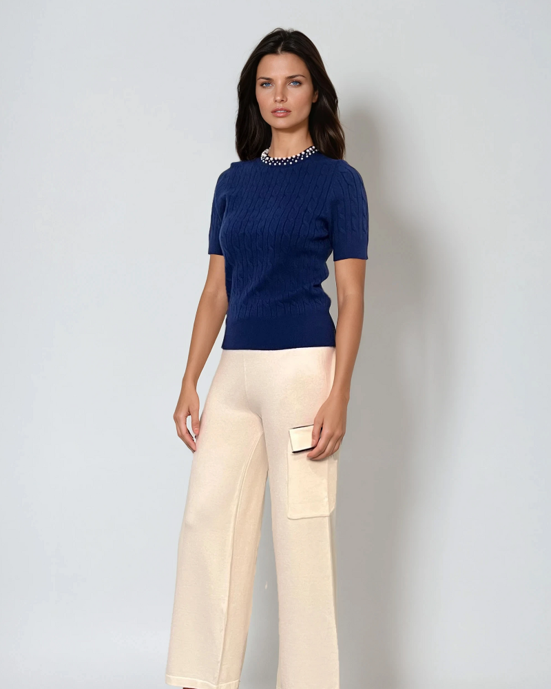 Pulover tricotat cu mânecă scurtă si perle albastru