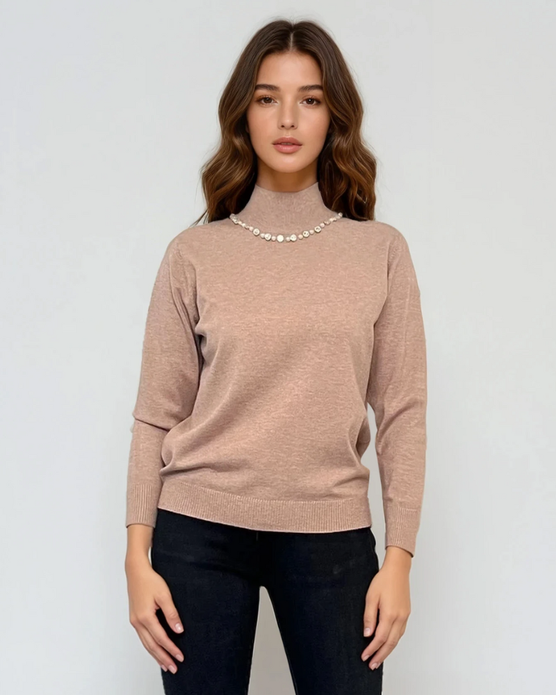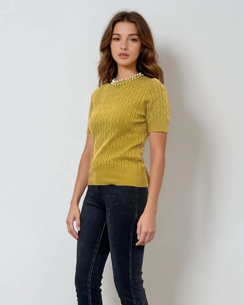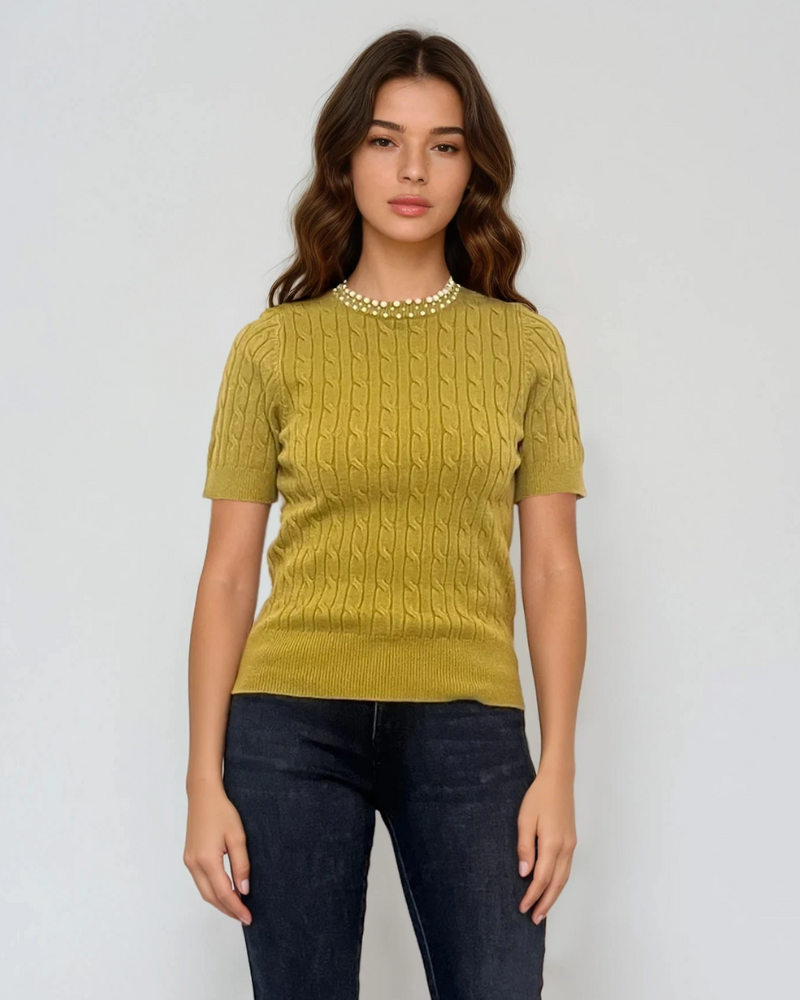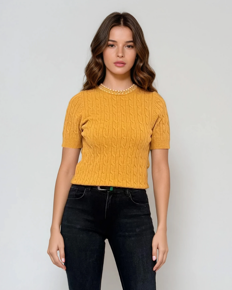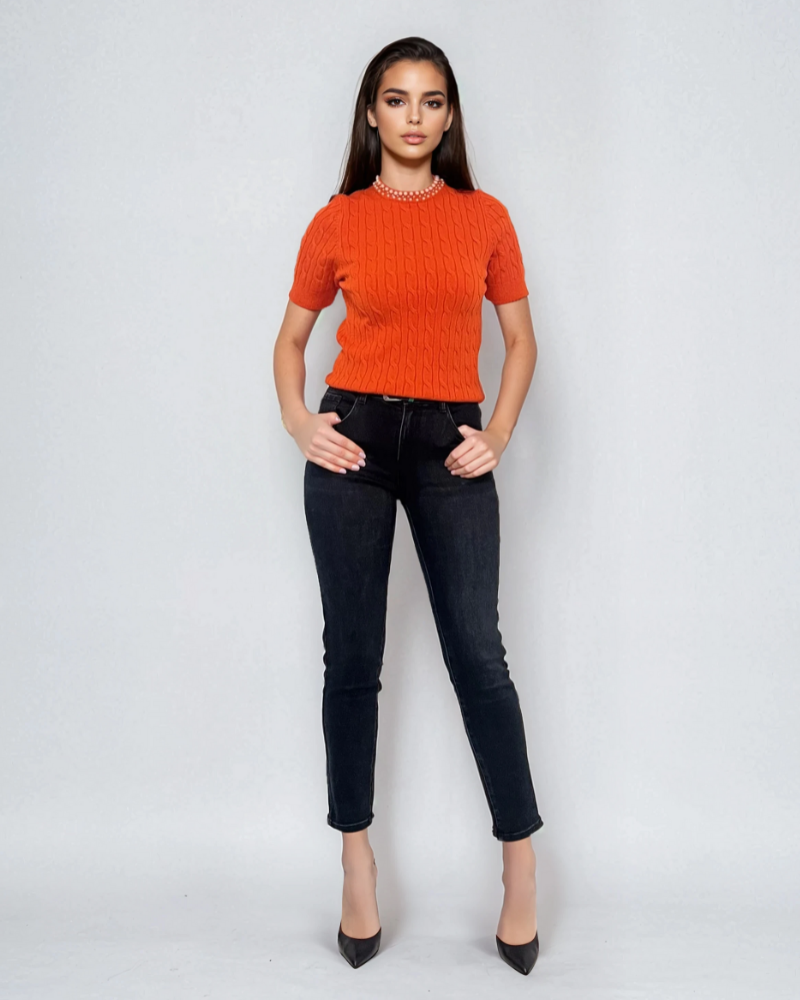 Pulover tricotat cu mânecă scurtă si perle portocaliu