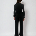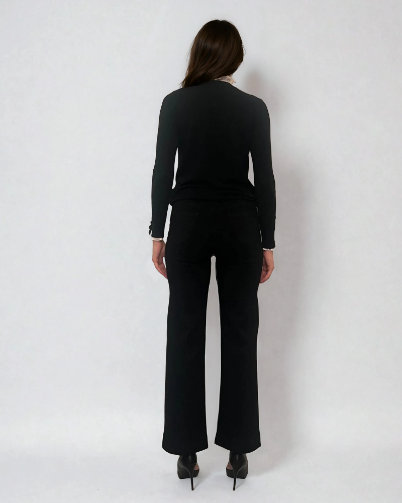 Pulover cu volan plisat la mânecă și gât negru, piesa de bază perfectă pentru orice garderobă. Designul clasic cu accente feminine îl face ușor de integrat atât în ținute office, cât și în look-uri casual elegante.