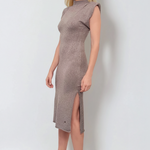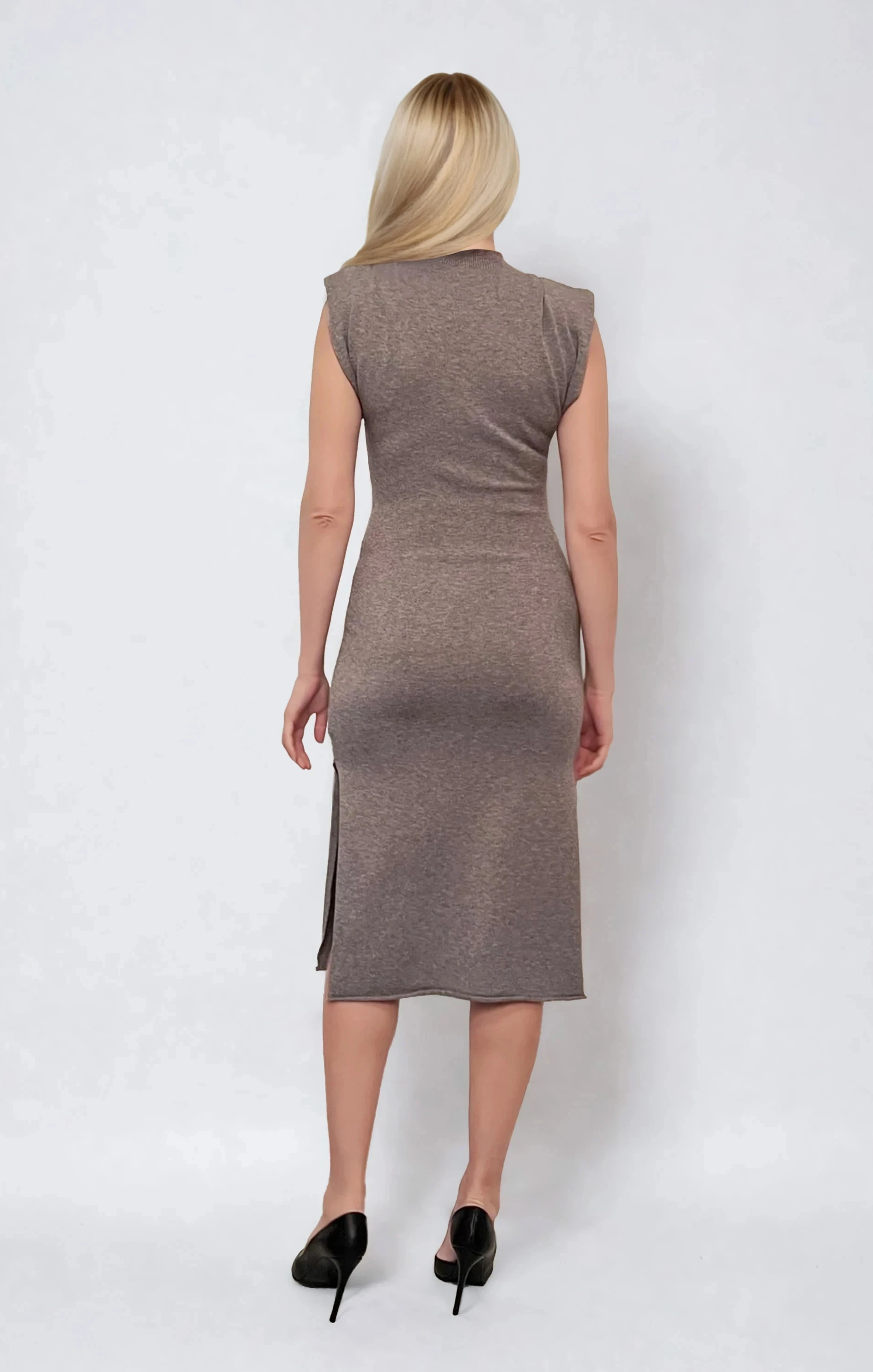 Rochie midi din tricot cu slituri laterale gri, un model ce îmbină confortul cu eleganța minimalistă. Croiala lejeră, umerii subtil ascunși și textura moale creează o piesă versatilă, ușor de integrat în ținute casual chic sau stil office relaxat.