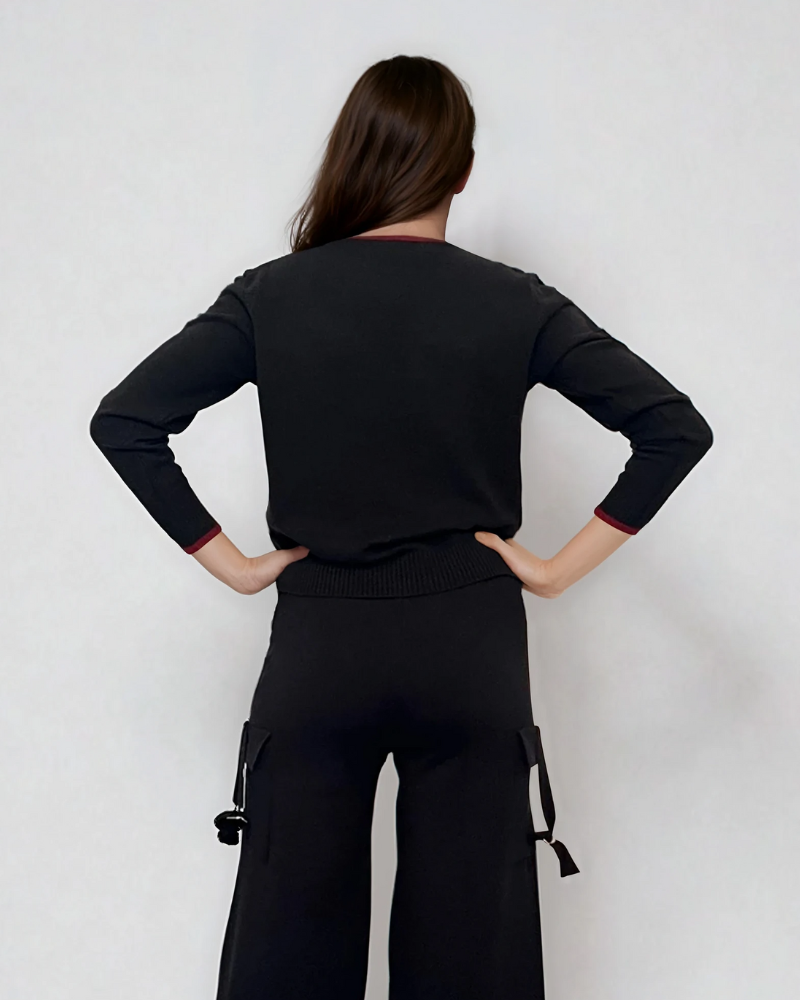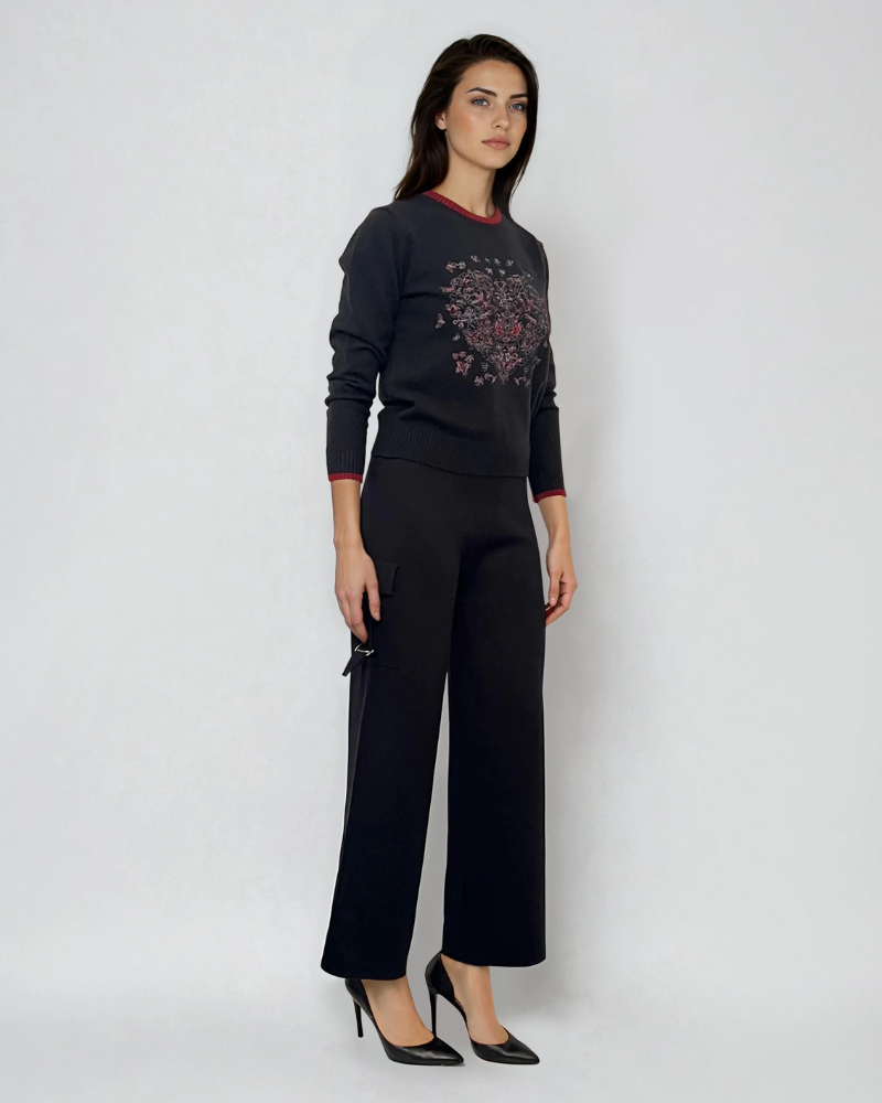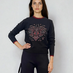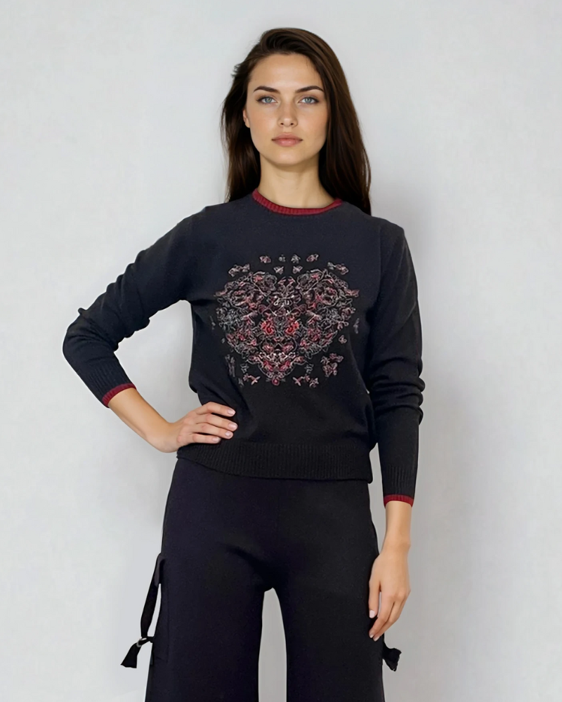 Pulover cu inimă brodată negru cu grena este alegerea ideală pentru un look feminin cu accente elegante. Broderia grena aduce un contrast rafinat pe fundalul negru, transformând o piesă simplă într-una cu atitudine.