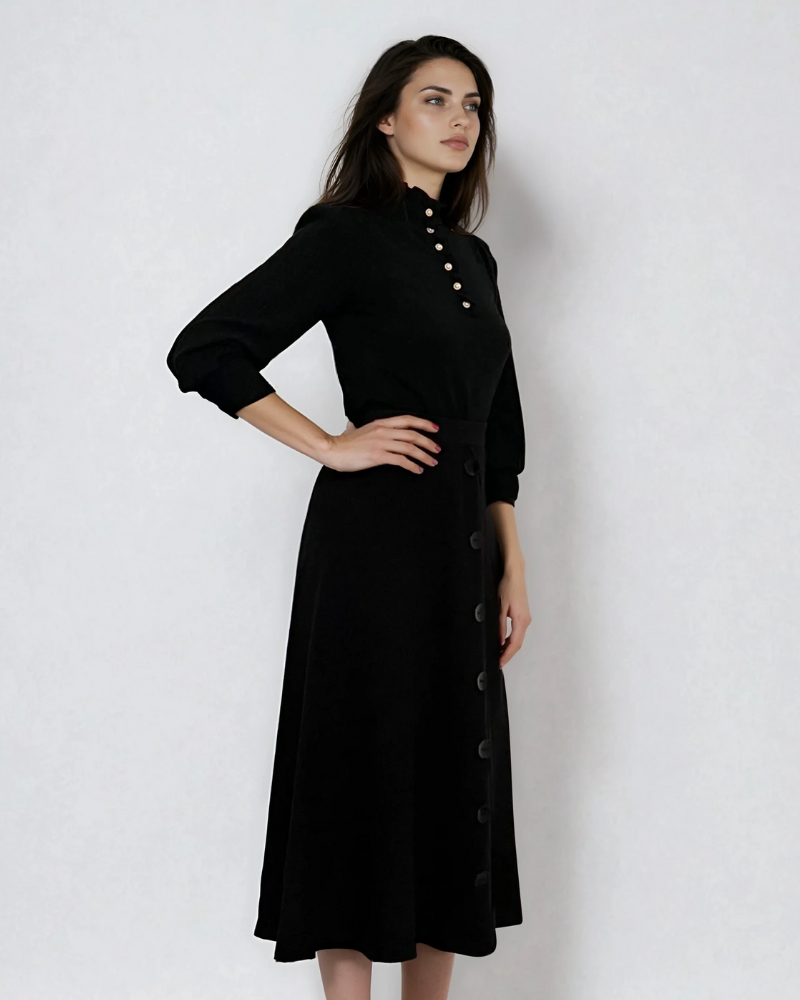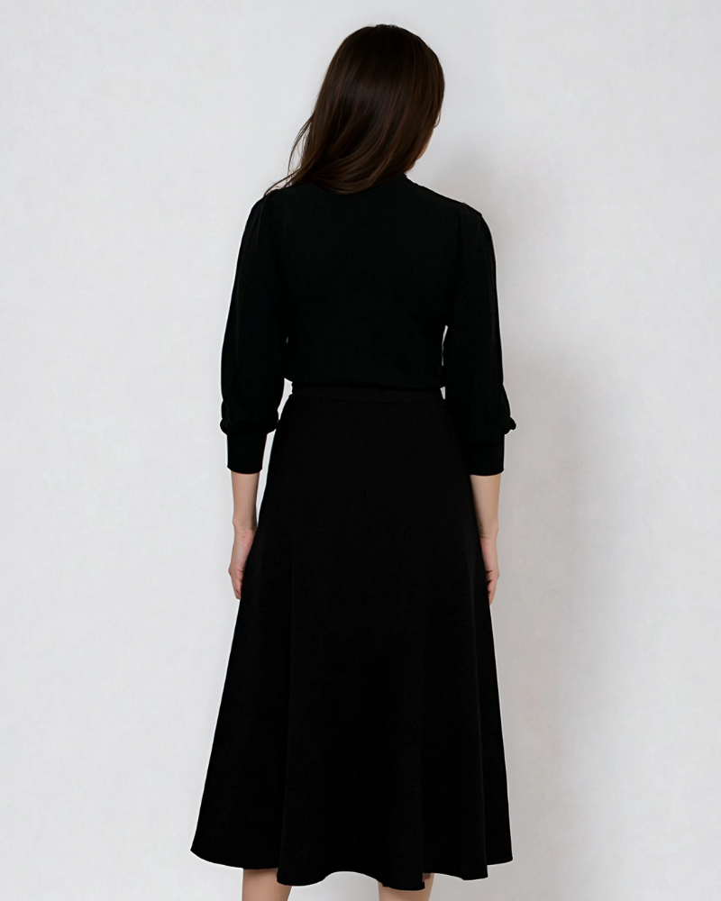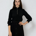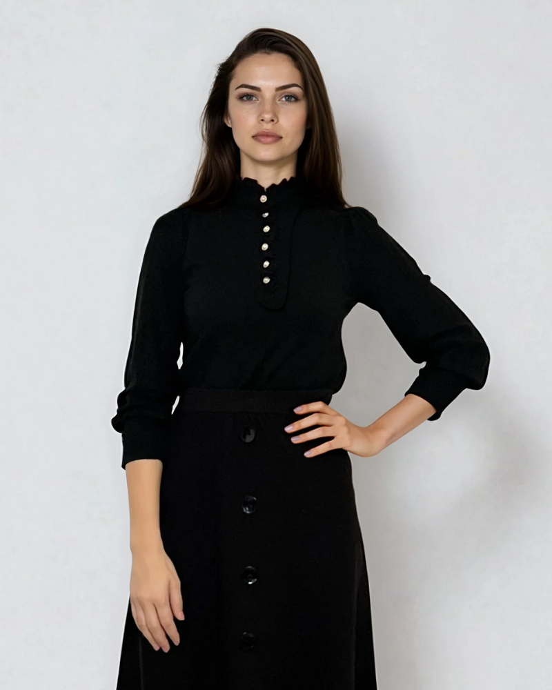 Pulover cu mâneci bufante și guler încrețit negru este piesa de bază care aduce eleganță în orice garderobă. Cu gulerul stilizat și nasturii discreți, acest model devine instantaneu o alegere sofisticată.