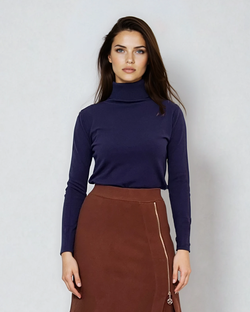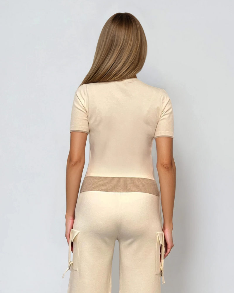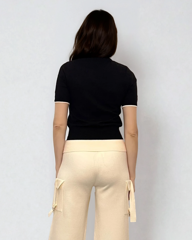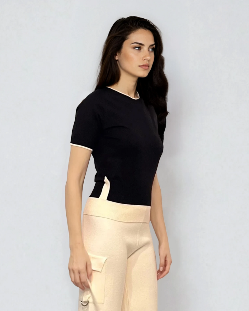 Pulover cu mânecă scurtă și bordură contrast bleumarin