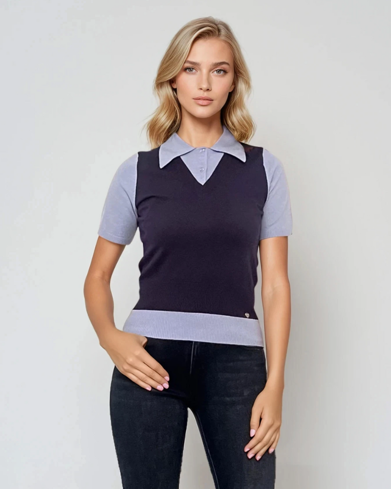 Pulover cu mânecă scurtă, guler cămașă și nasturi bleumarin