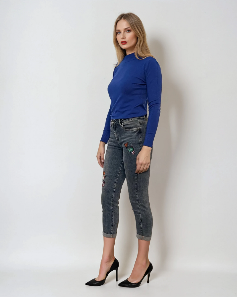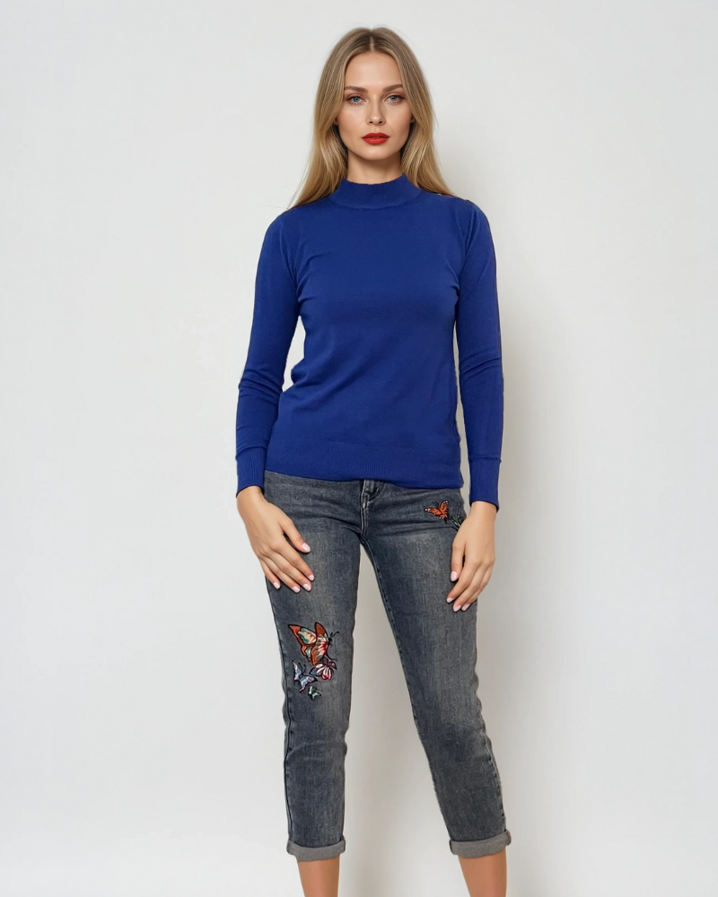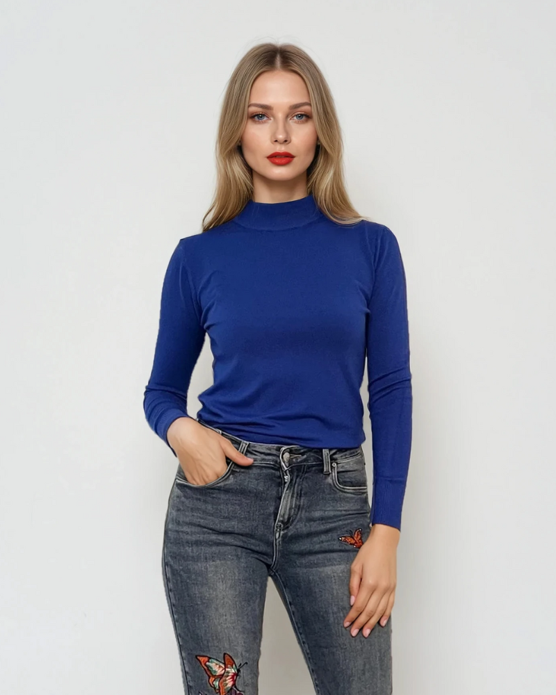 Pulover basic cu guler scurt albastru se remarcă prin eleganță discretă și confort pentru birou. Materialul din vâscoză delicată asigură o ținută fină, plăcută la atingere, iar croiala simplă îl face versatil.