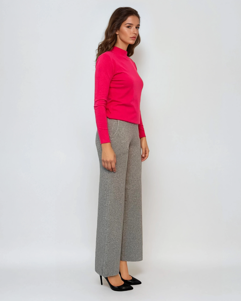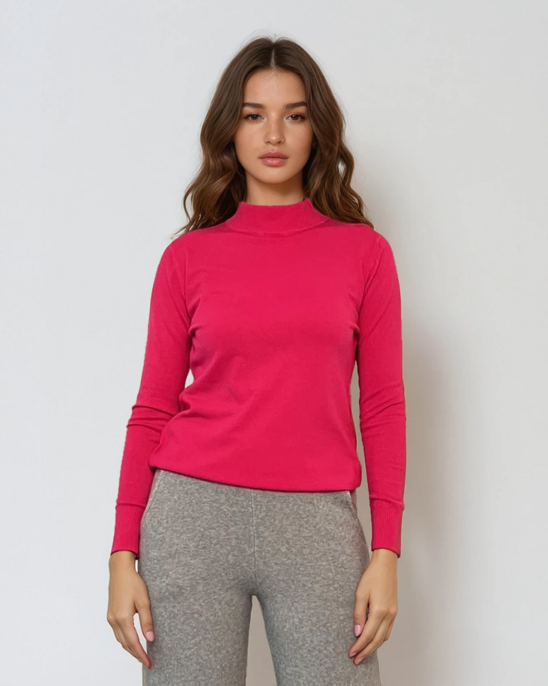 Pulover basic cu guler scurt ciclam adaugă o notă jucăușă și vibrantă garderobei tale de birou. Vâscoza moale susține o purtare confortabilă, iar nuanța intensă te face remarcată.