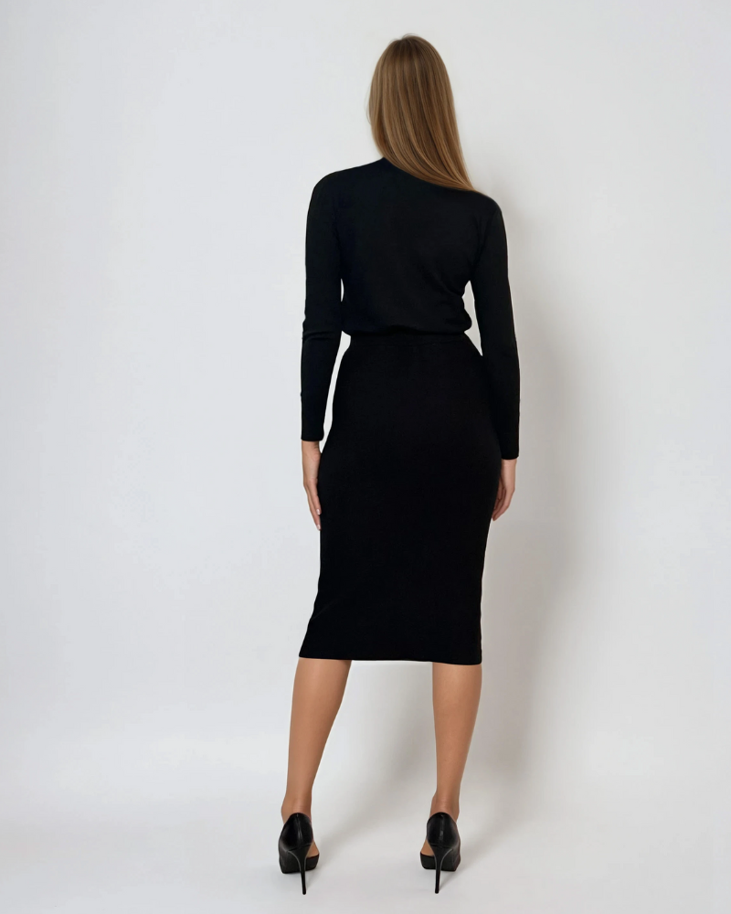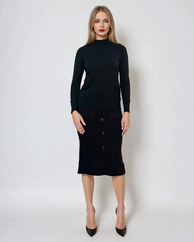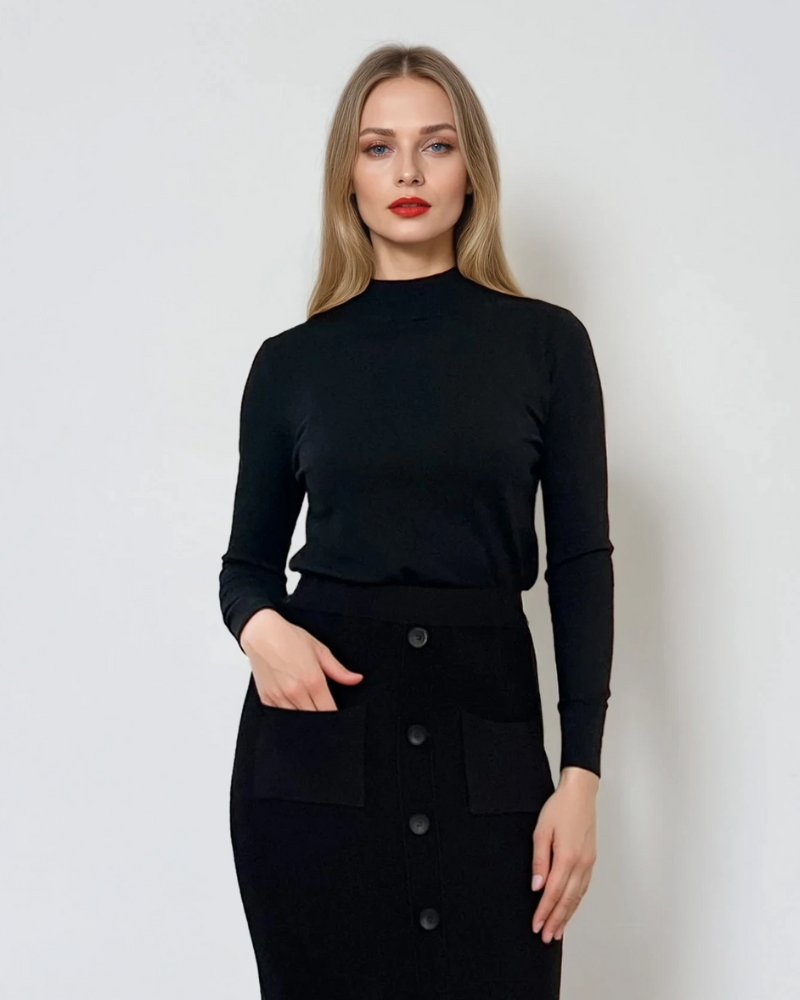 Pulover basic cu guler scurt negru este o piesă esențială și atemporală în garderoba office. Vâscoza fină asigură confort și alunecă frumos pe piele, în timp ce designul simplu oferă versatilitate.