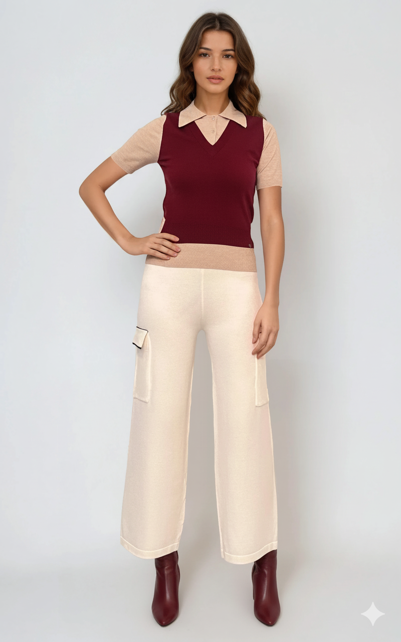 Tonul grena se asortează perfect cu tonuri neutre sau pastelate, oferind contrast și personalitate outfitului.