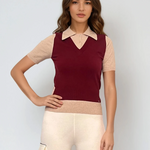 Pulover cu mânecă scurtă, guler cămașă și nasturi grena
