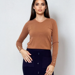 Puloverul en-coeur cu nasturi pe mâneci beige oferă un look sofisticat și echilibrat. Croiala feminină și nasturii subtili de pe mâneci sunt accente care scot puloverul din zona clasică.