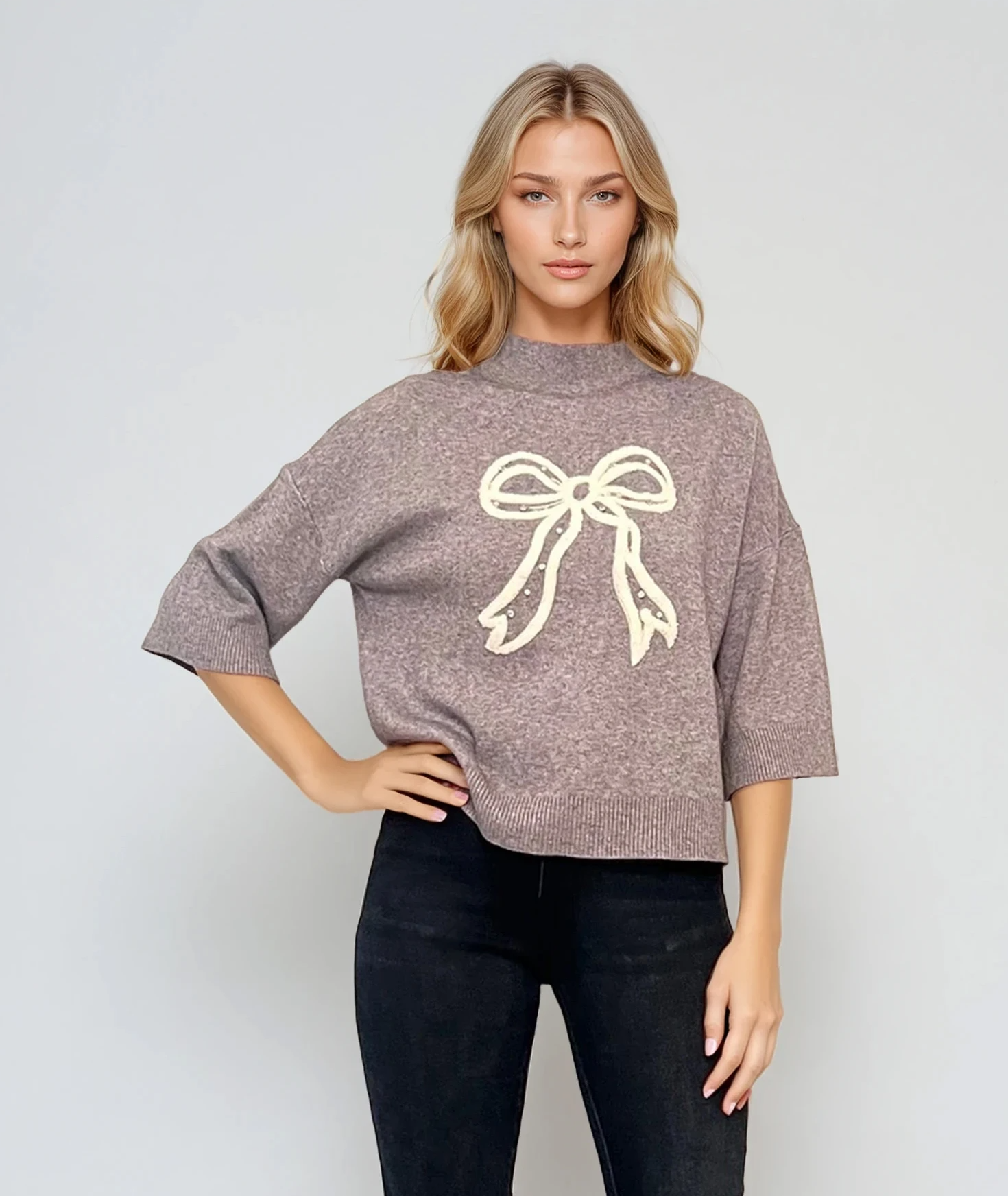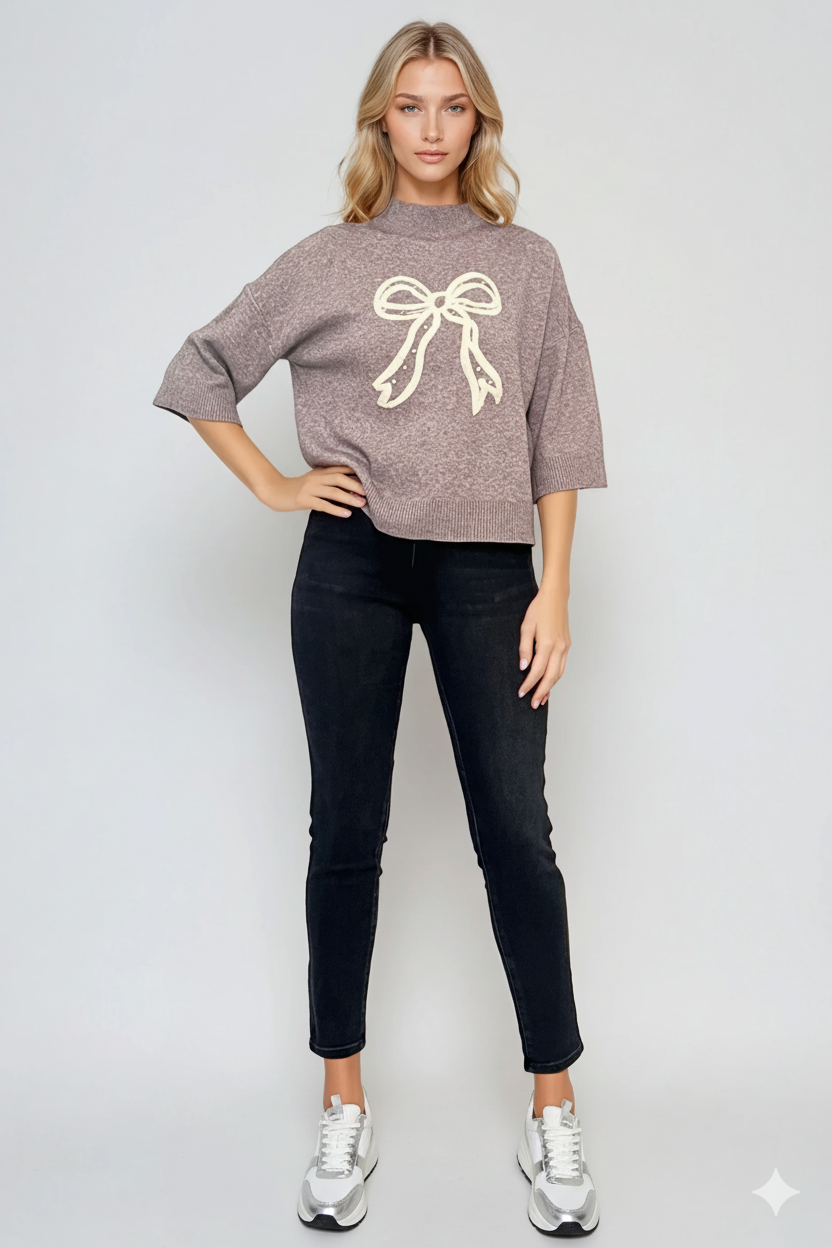 Pulover gri tricotat cu mânecă 3/4 și fundă decorativă în față, ideal pentru ținute de zi cu un aer discret feminin. Modelul este versatil și ușor de integrat în garderoba de toamnă.