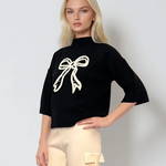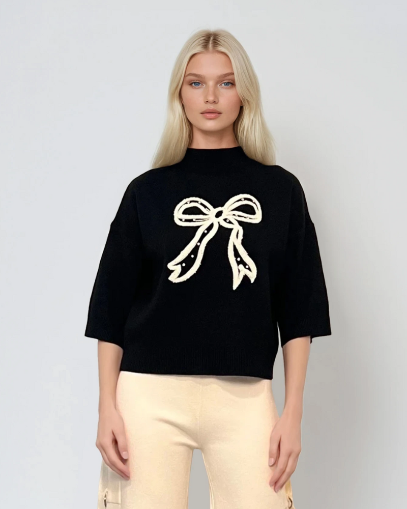 Pulover tricotat cu fundă ?i mânecă 3/4 negru