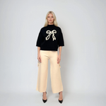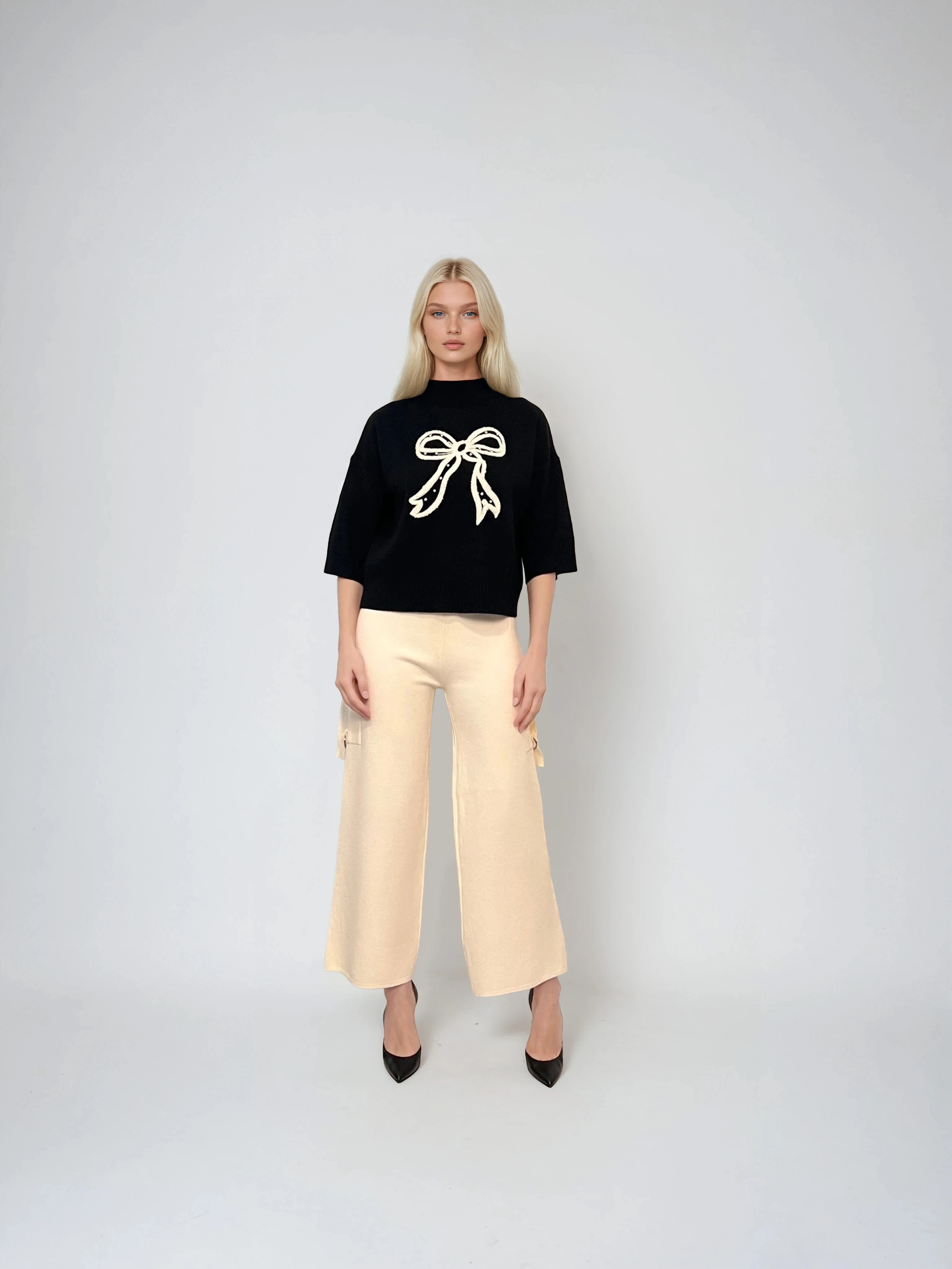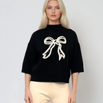 Pulover negru din tricot, cu fundă subtilă și mânecă 3/4, perfect pentru ținute moderne și echilibrate. Este o alegere versatilă pentru sezonul rece, oferind un echilibru între confort și stil feminin.