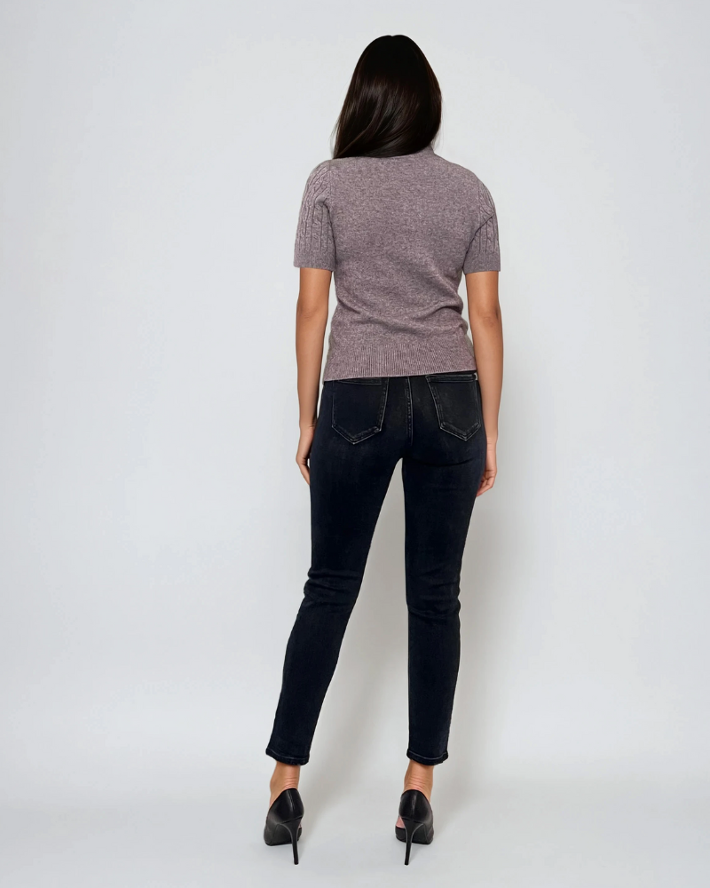 Pulover tricotat cu mânecă scurtă și perle gri este o piesă esențială pentru o garderobă minimalistă și rafinată. Nuanta neutră se potrivește ușor cu diverse combinații, în timp ce detaliile cu perle adaugă feminitate.