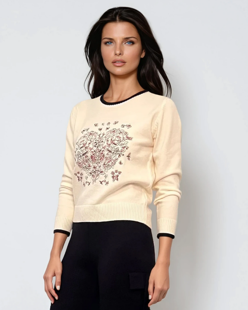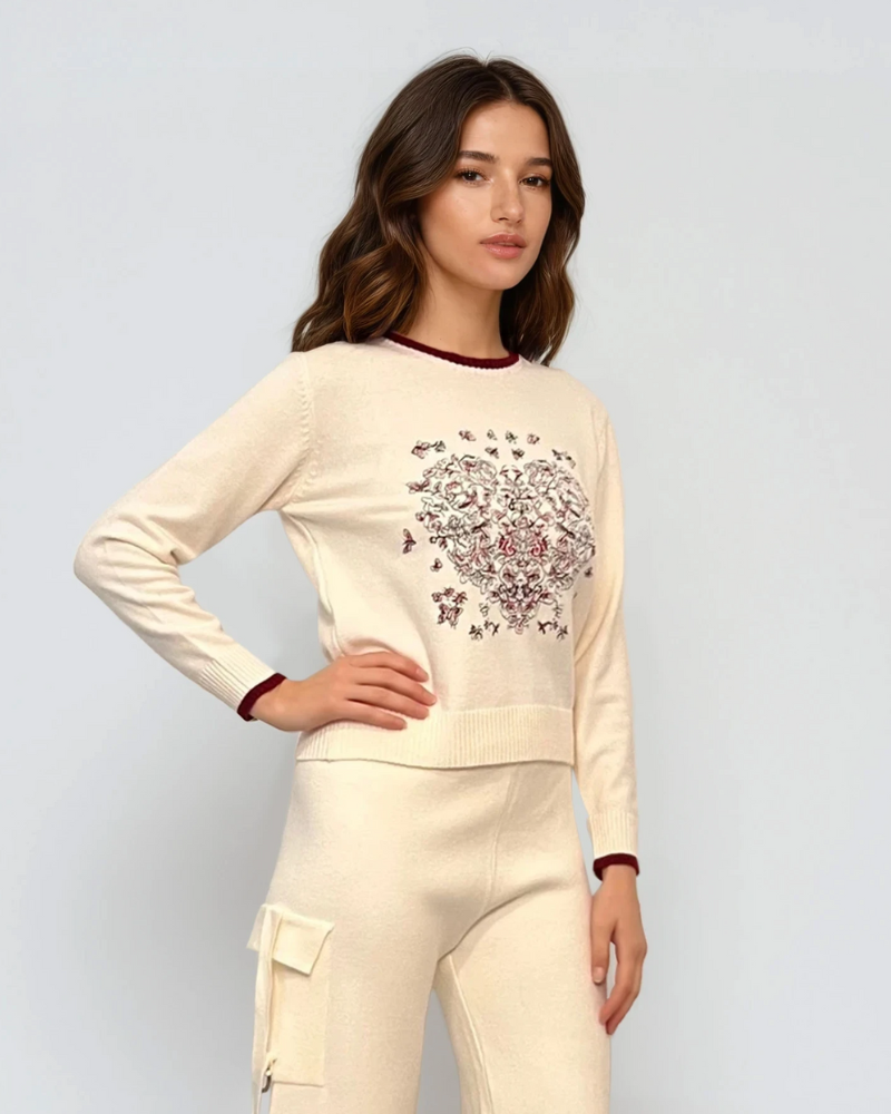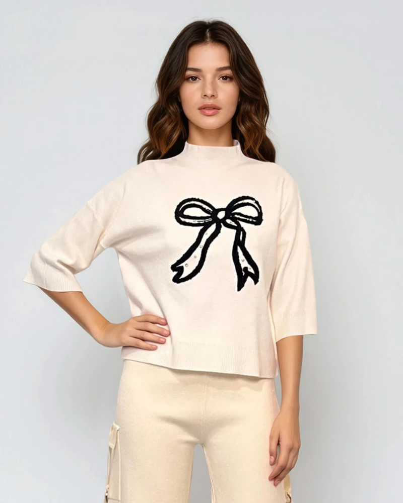 Pulover tricotat cu fundă ?i mânecă 3/4 alb