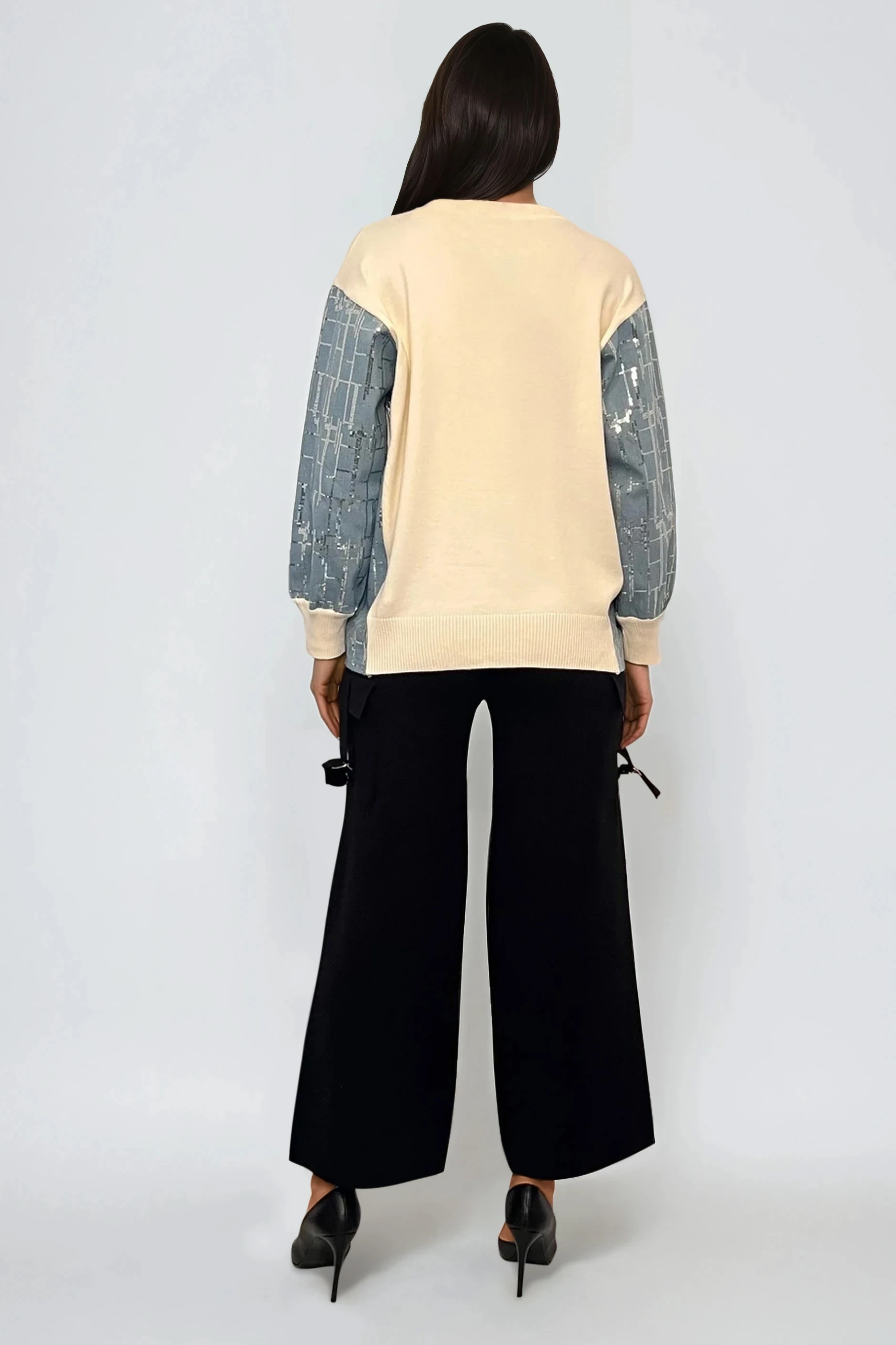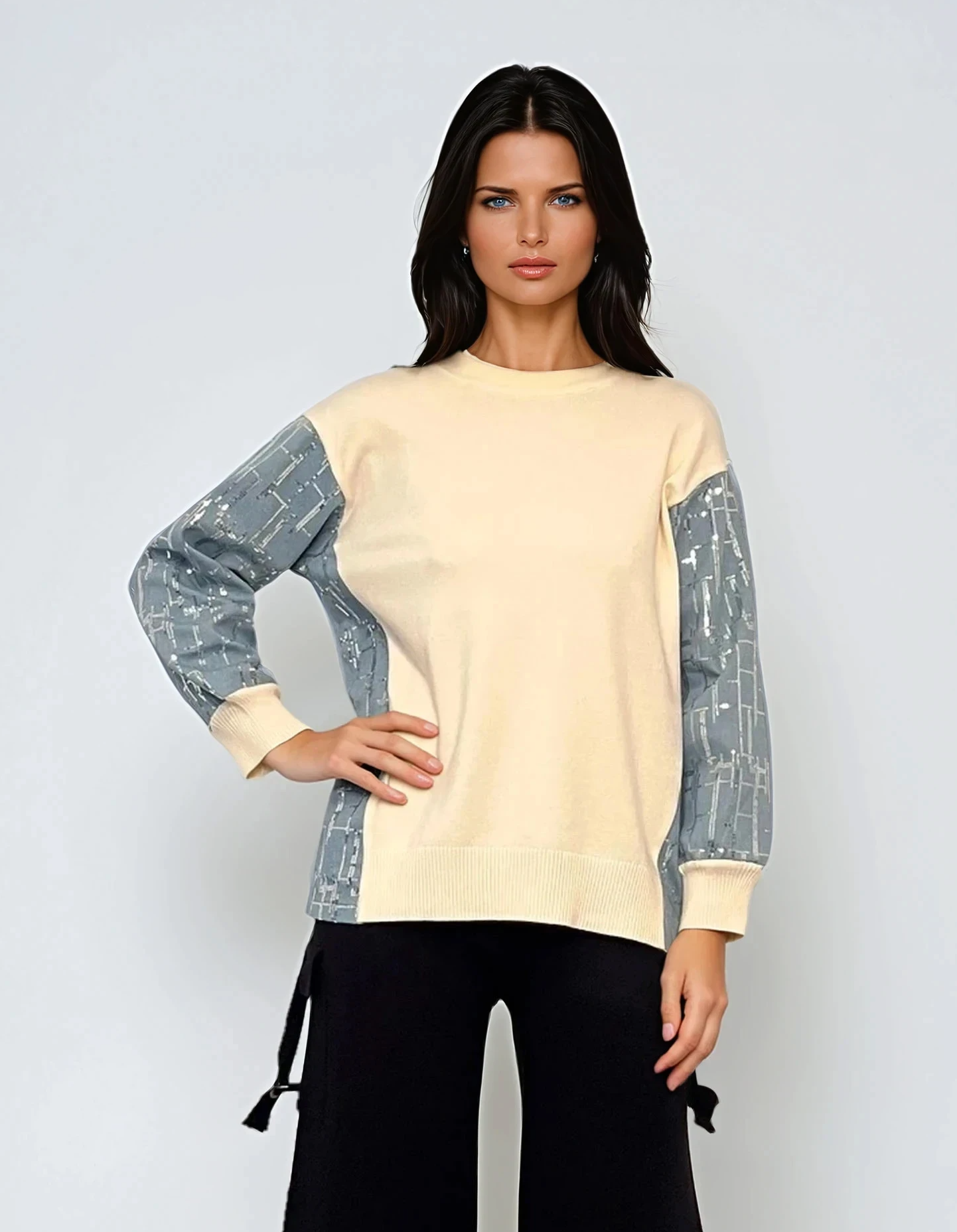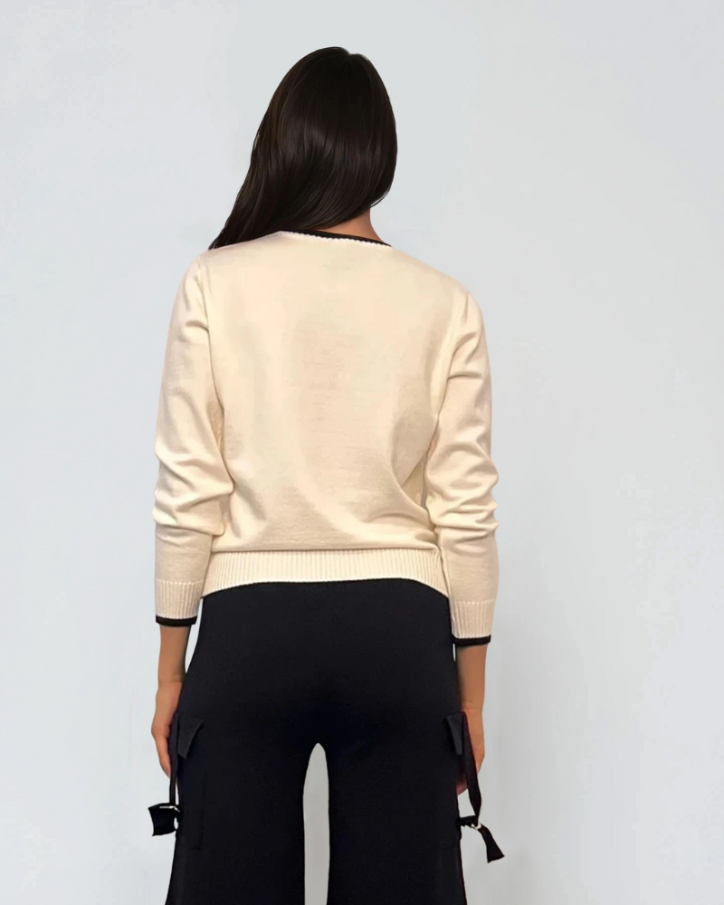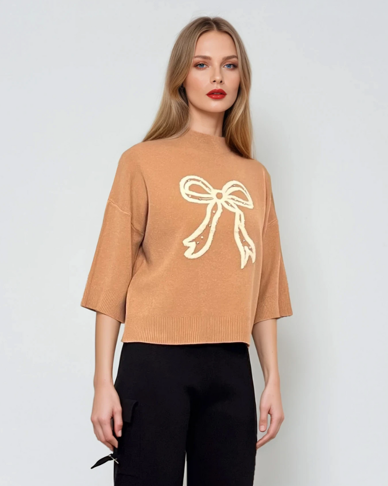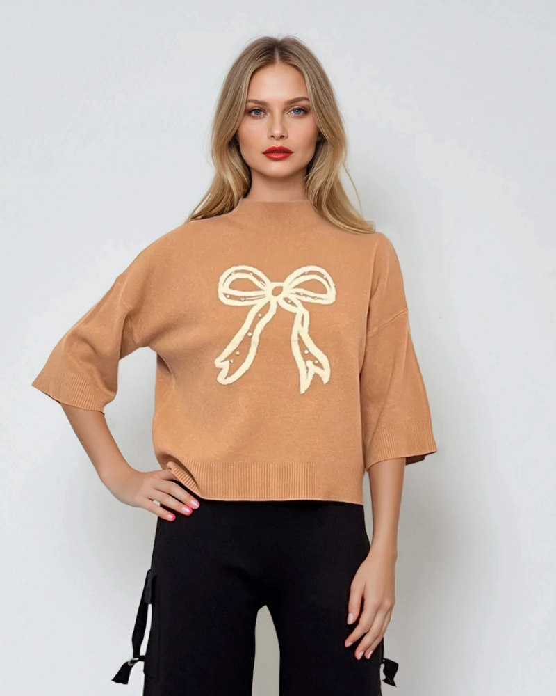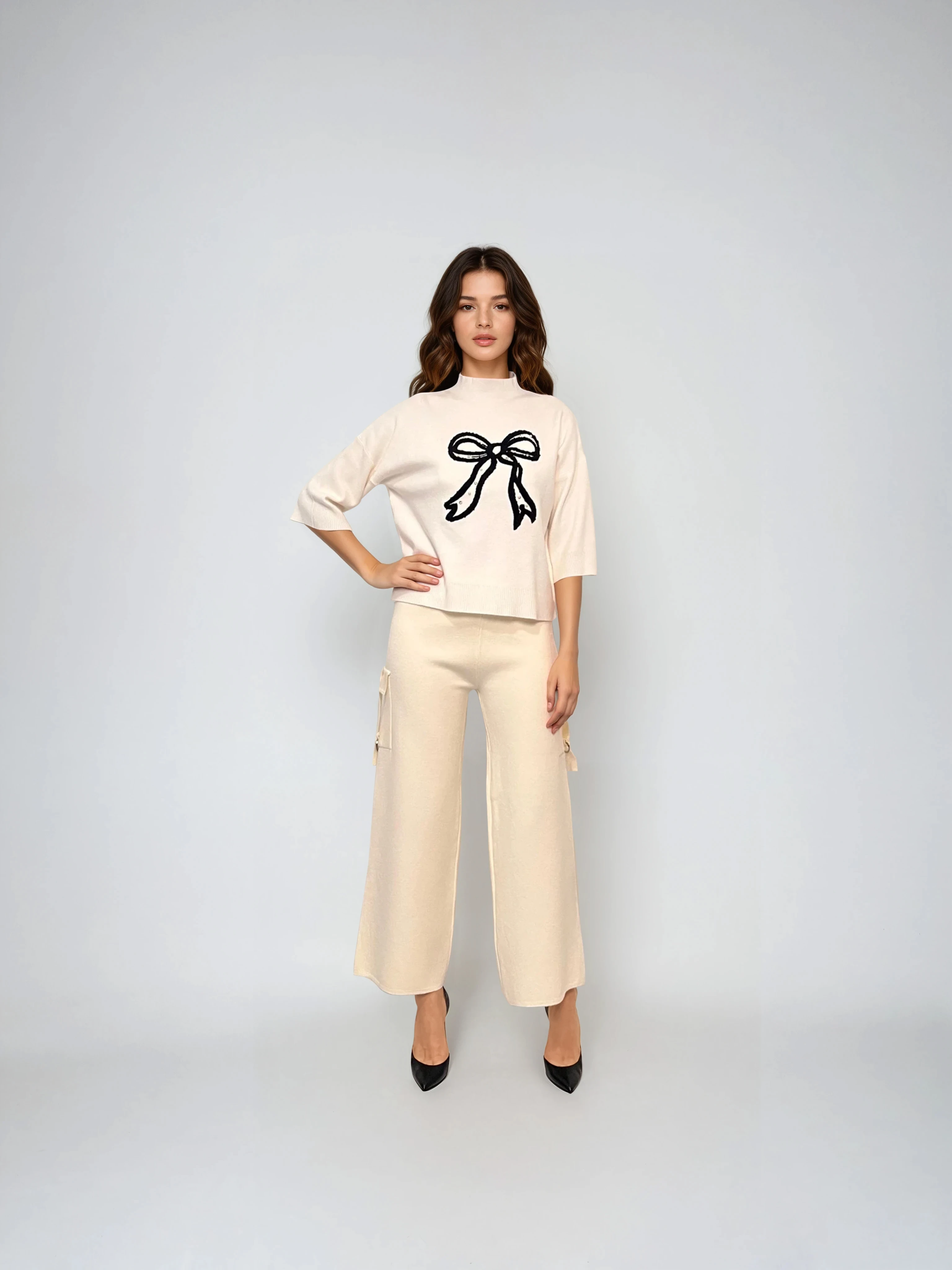 Pulover tricotat cu fundă ?i mânecă 3/4 beige