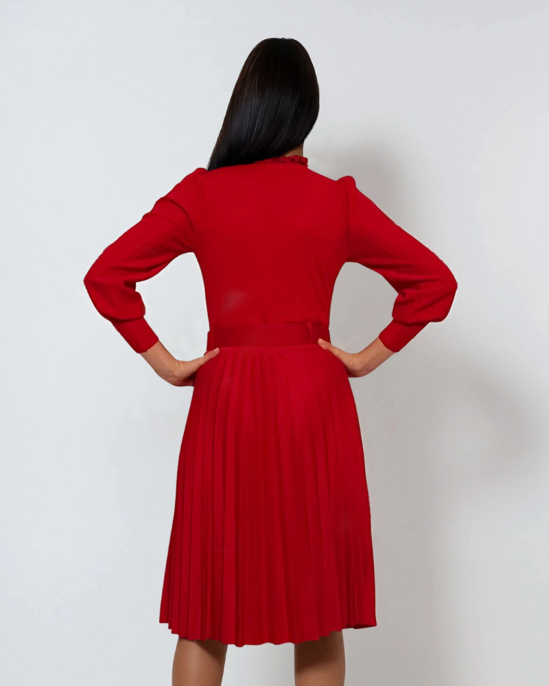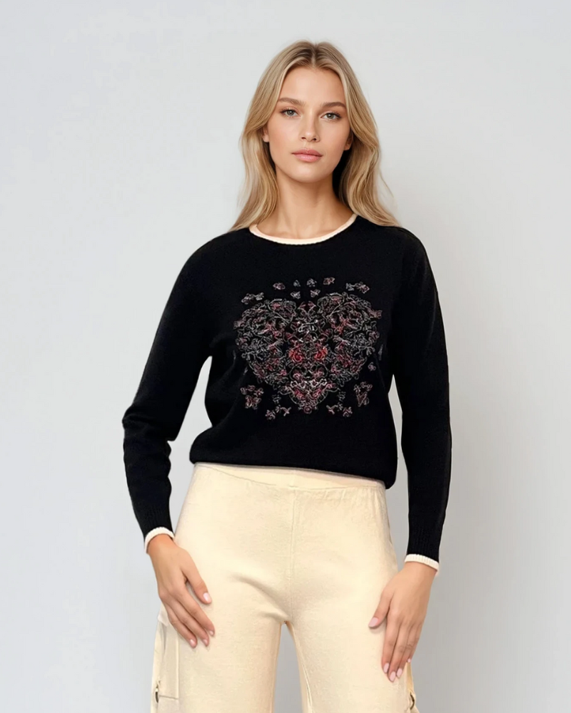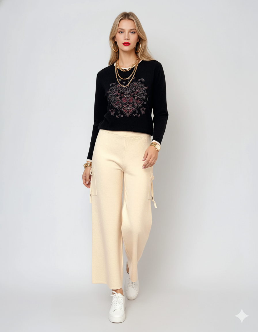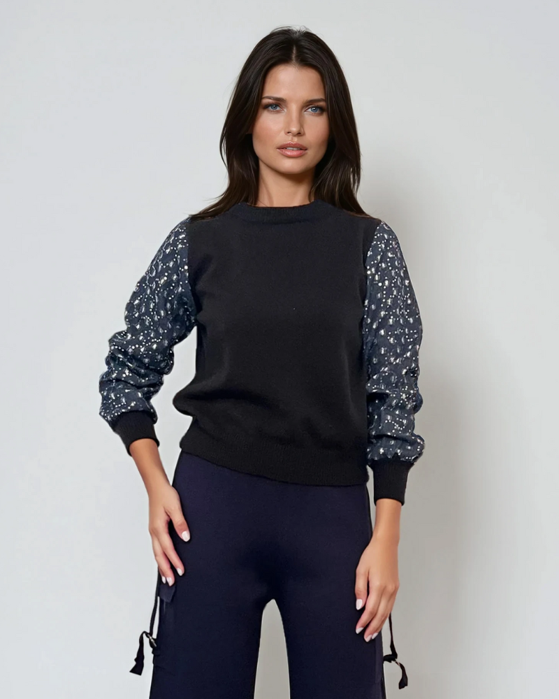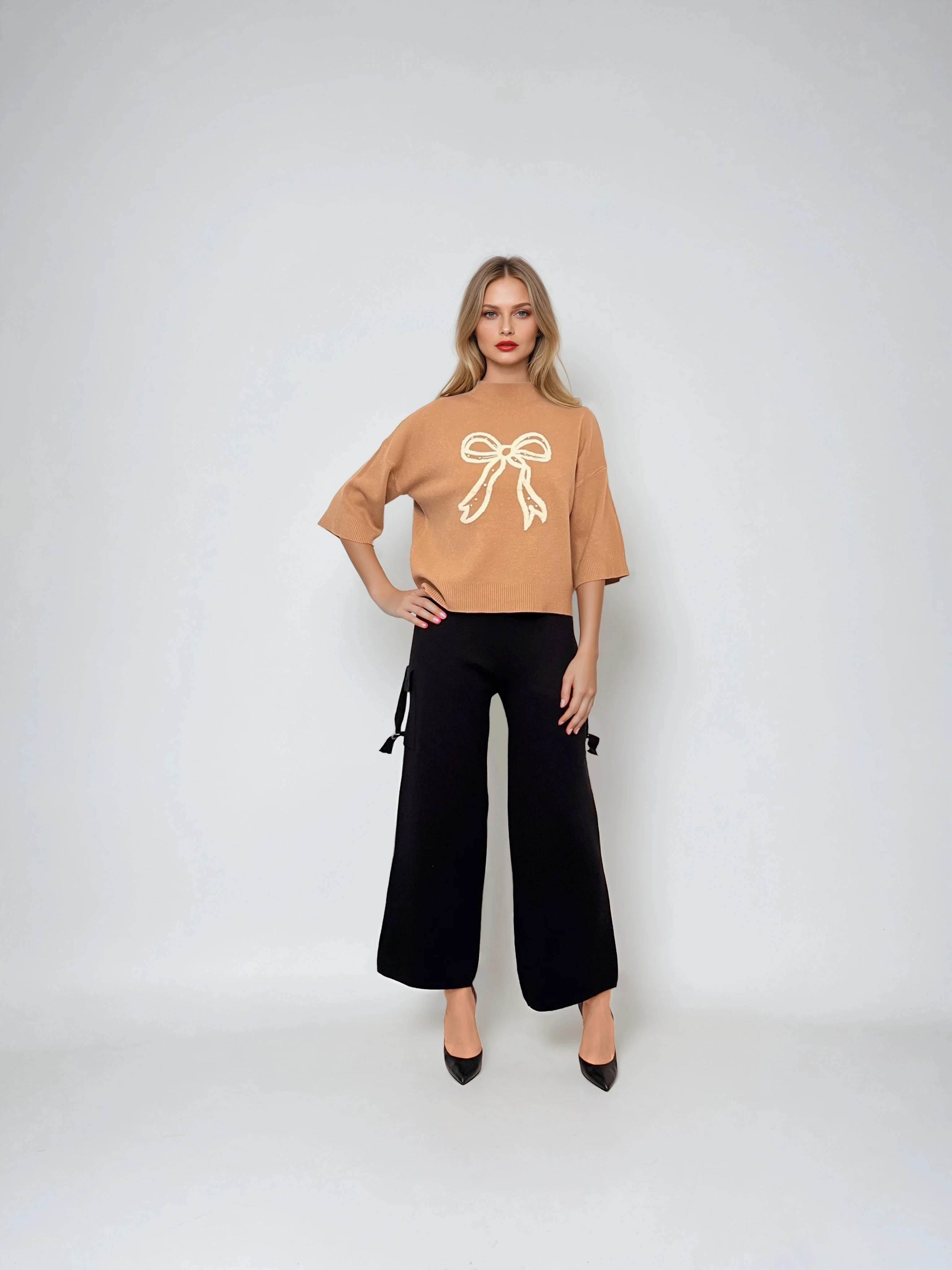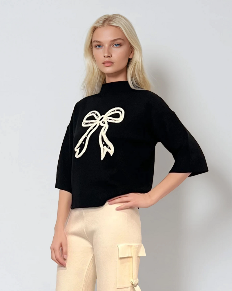 Pulover tricotat cu fundă ?i mânecă 3/4 negru