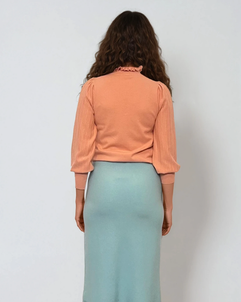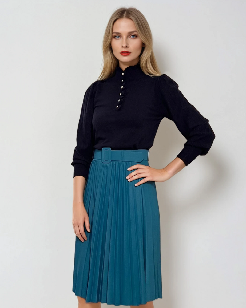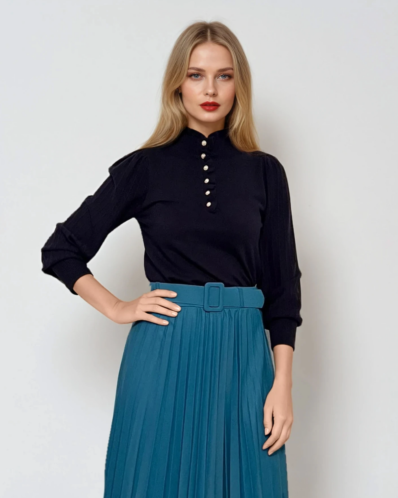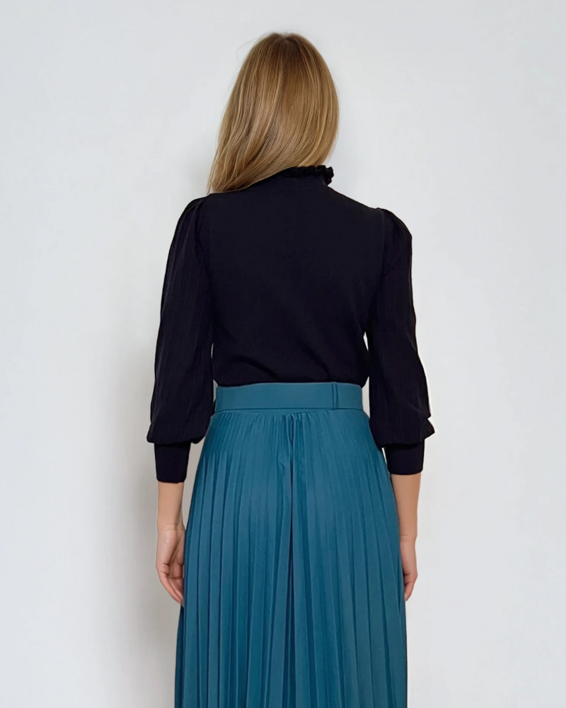 Pulover cu mâneci bufante si guler încretit bleumarin