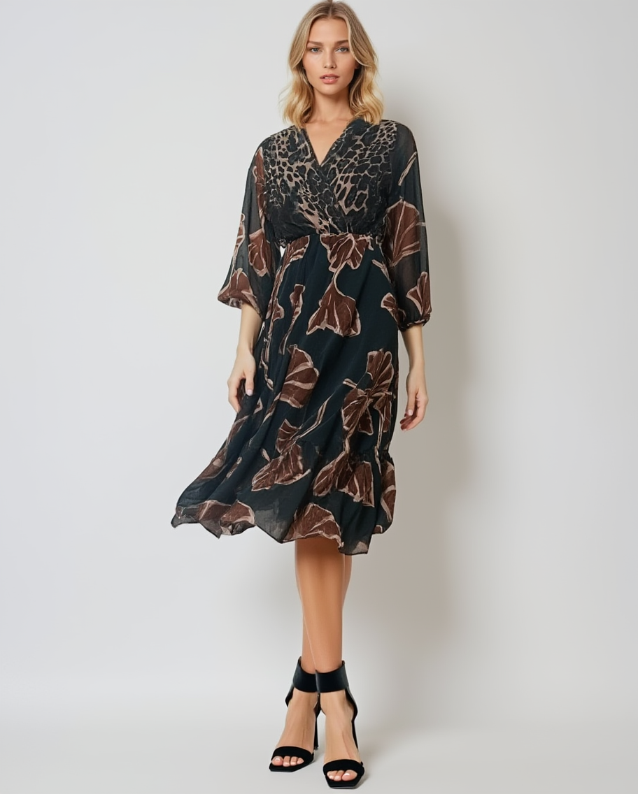 Rochie lungă cu imprimeu, decolteu adânc turcoaz aduce un suflu proaspăt garderobei de vară. Nuanțele vii și imprimeul original creează un efect vizual atrăgător, iar elasticul din talie asigură o potrivire confortabilă pentru mai multe siluete. Este alegerea ideală pentru zilele însorite și serile relaxante.