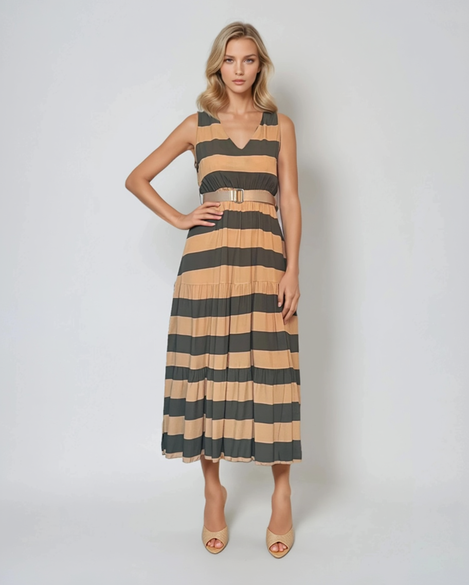 Rochie lungă fără mâneci cu dungi și curea inclusă kaki combină naturalețea culorii cu un design modern și practic. Materialul ușor și lipsa mânecilor o transformă într-o piesă ideală pentru zilele călduroase de vară.