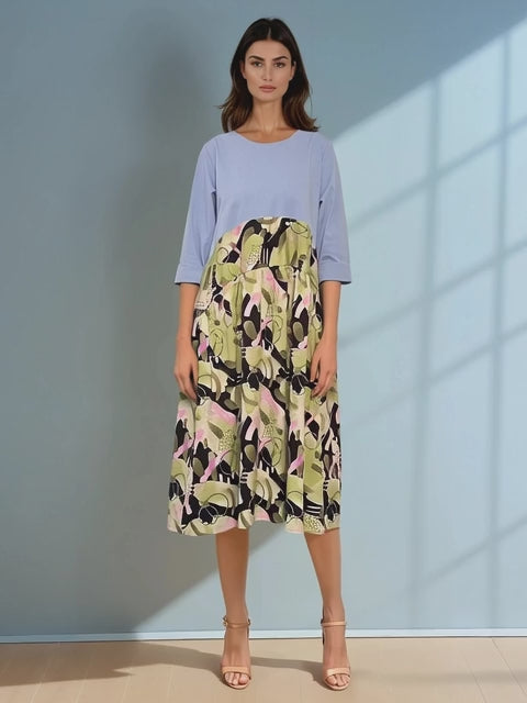 Rochie largă cu print la poale și mânecă 3/4 bleu
