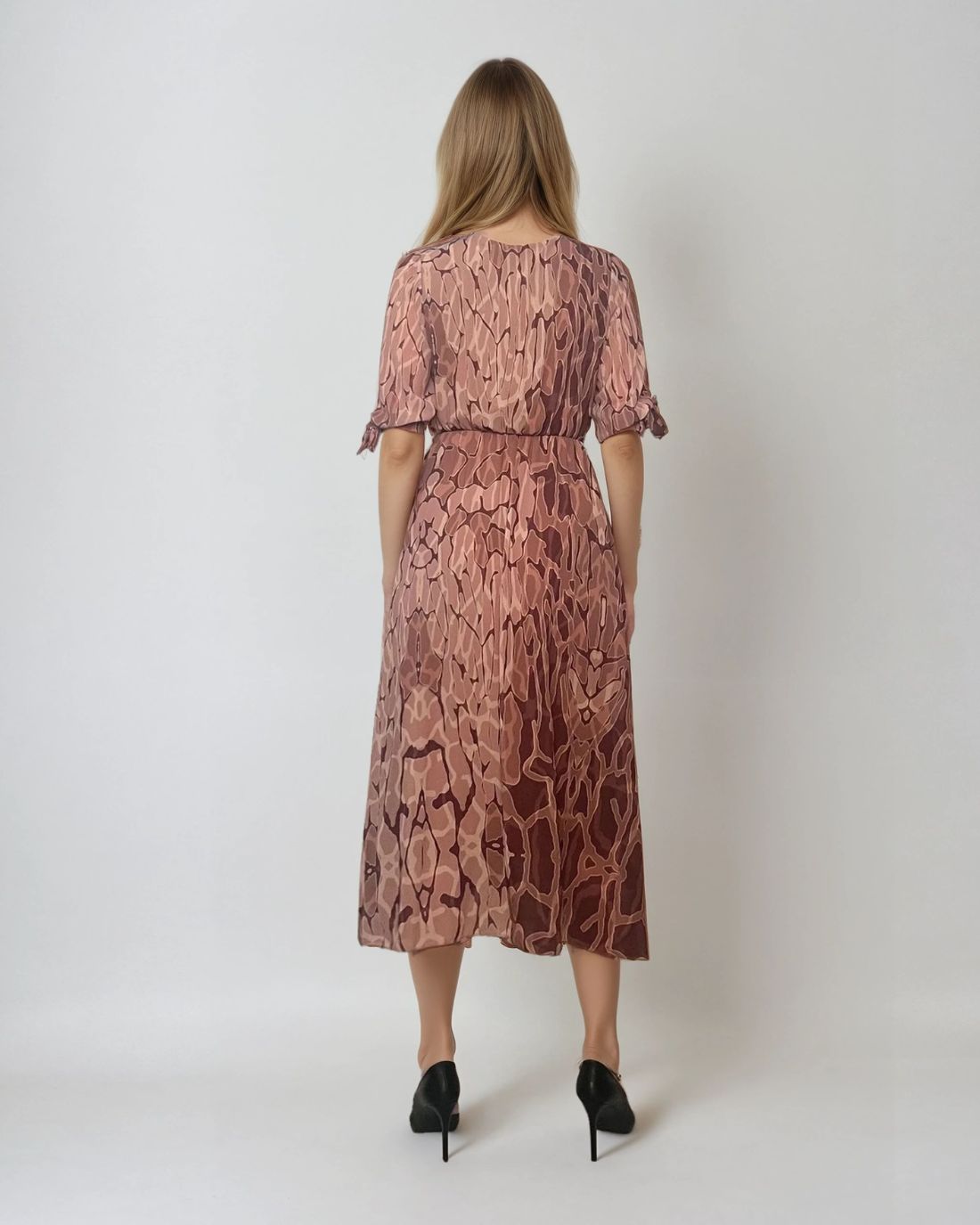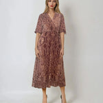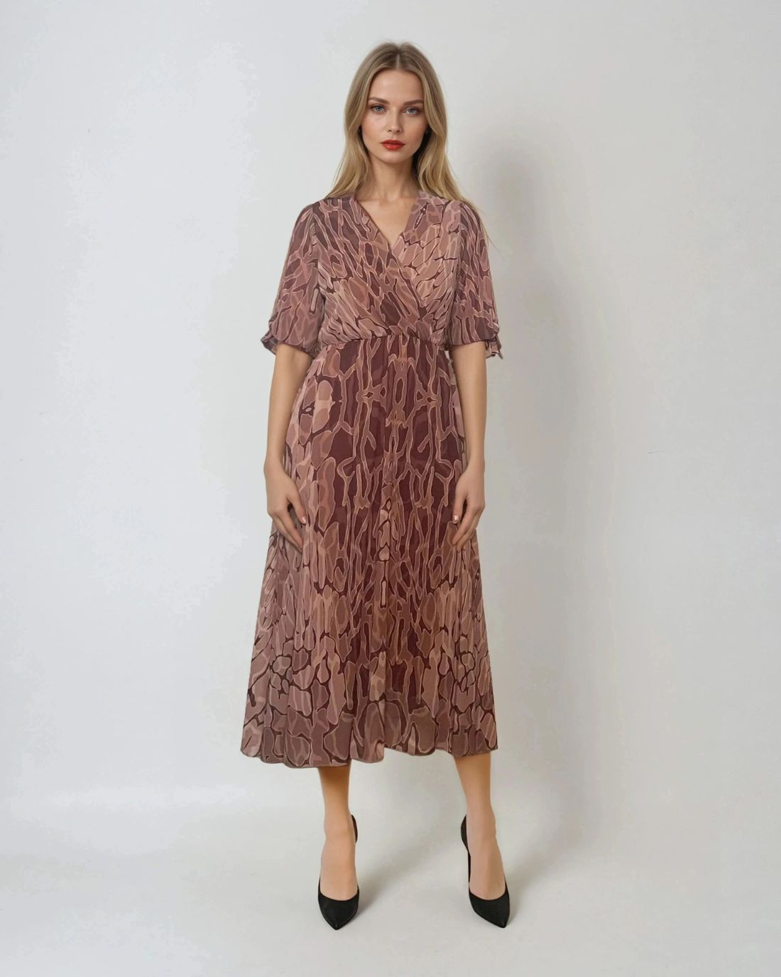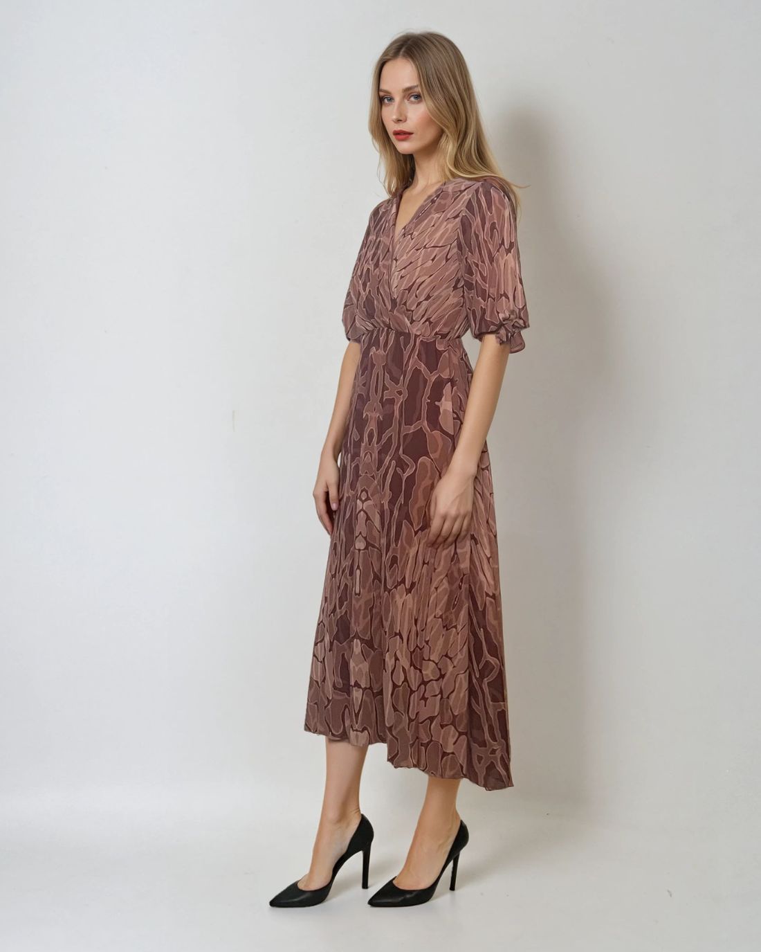 Rochie lungă vaporoasă din voal cu print floral beige este alegerea perfectă pentru evenimente de zi sau seri elegante de vară. Nuanța caldă pune în valoare imprimeul floral delicat, iar decolteul adânc în V oferă un plus de feminitate. Elasticul din talie se adaptează mai multor conformații, iar căptușeala moale din vâscoză sporește confortul.
