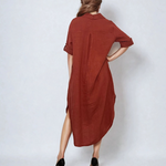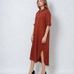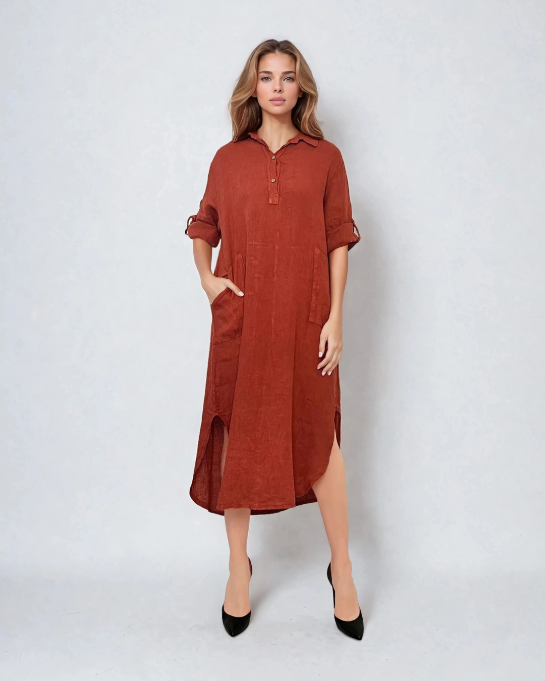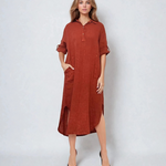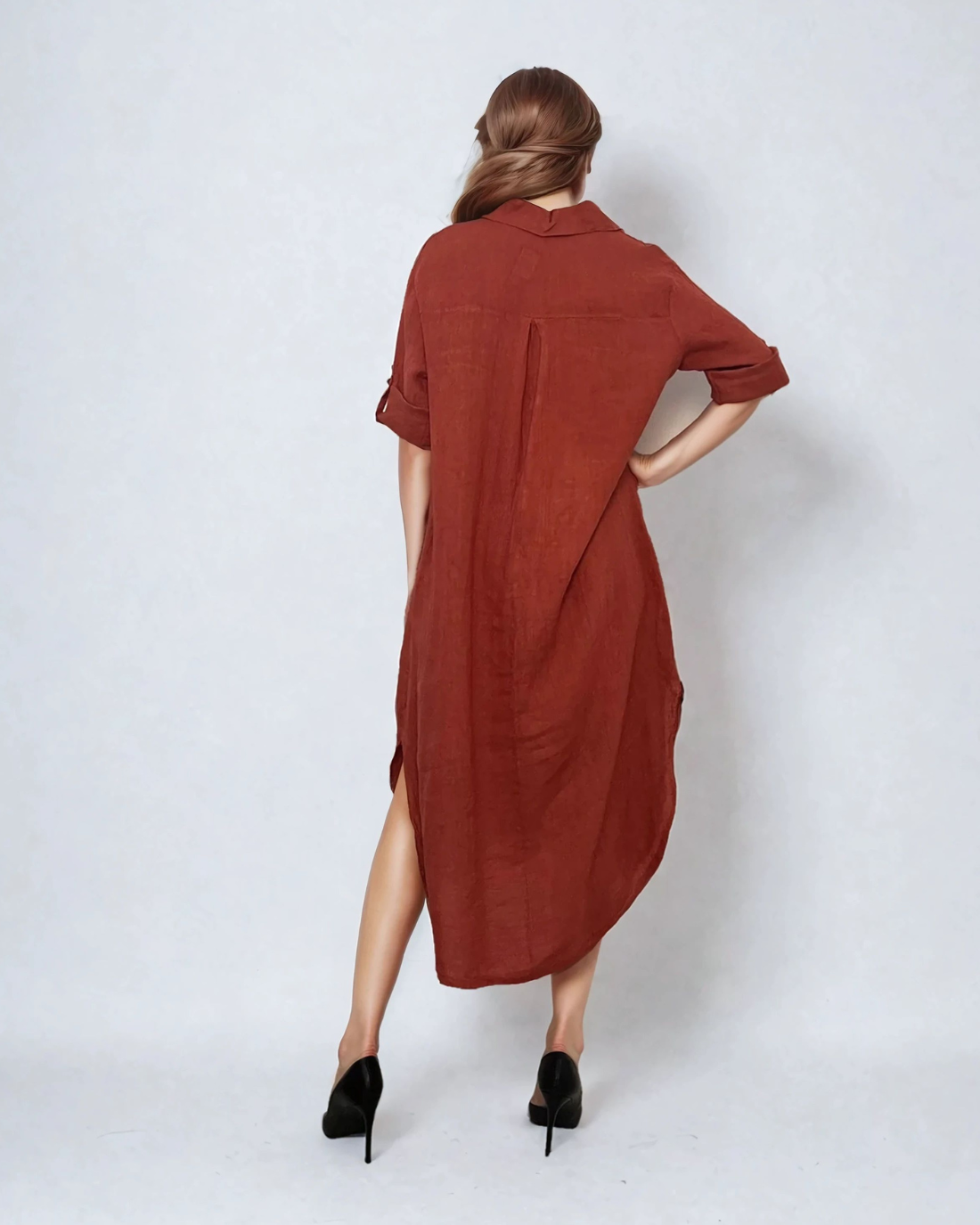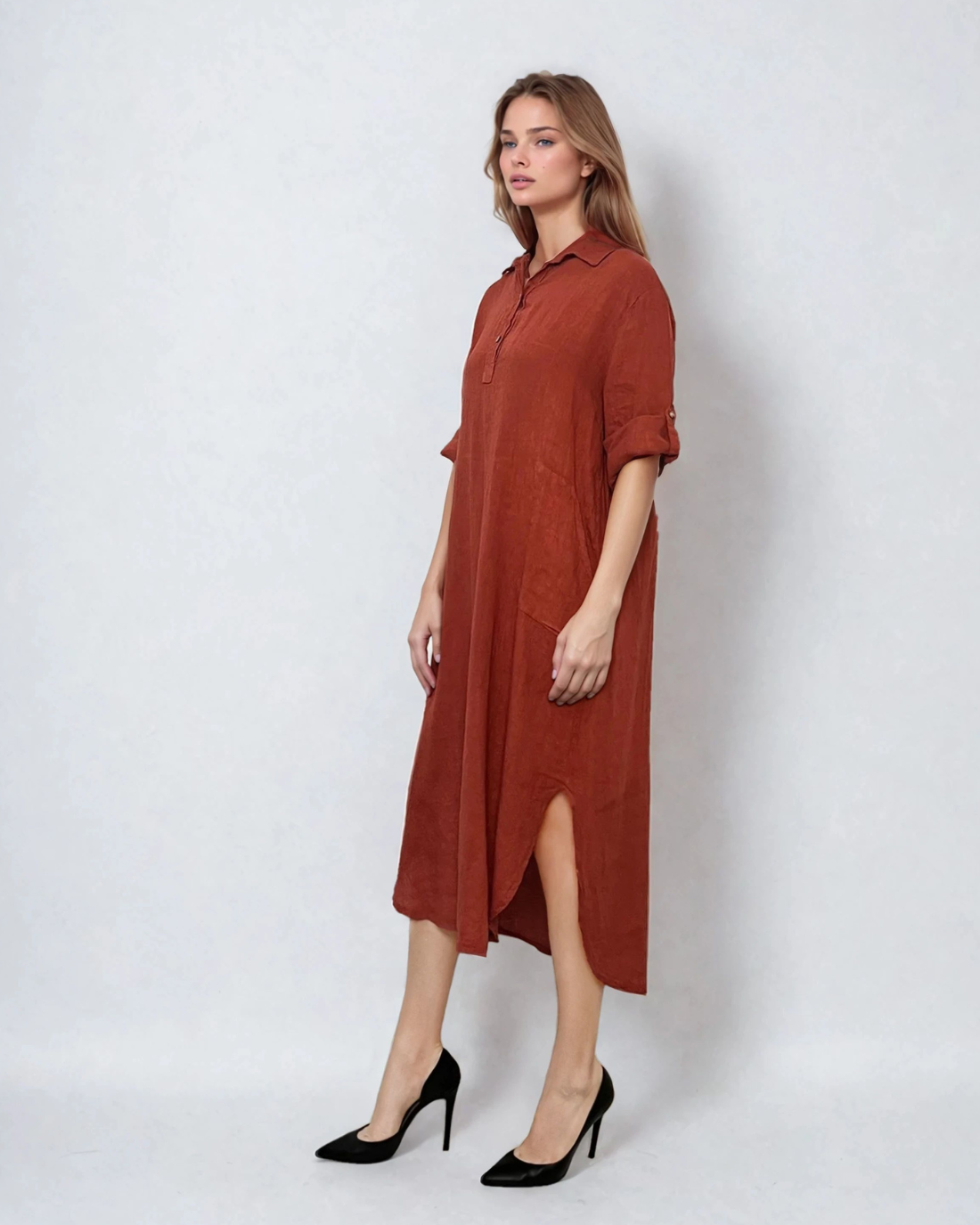 Rochie midi cămașă din in cu mânecă lungă și șlițuri laterale caramiziu