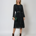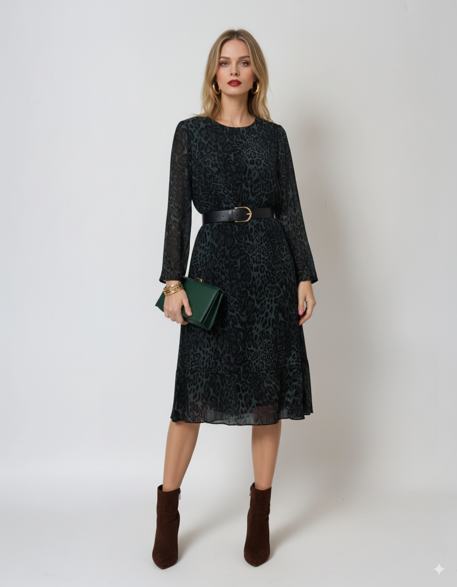 Rochie midi cu mânecă lungă și animal print verde