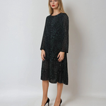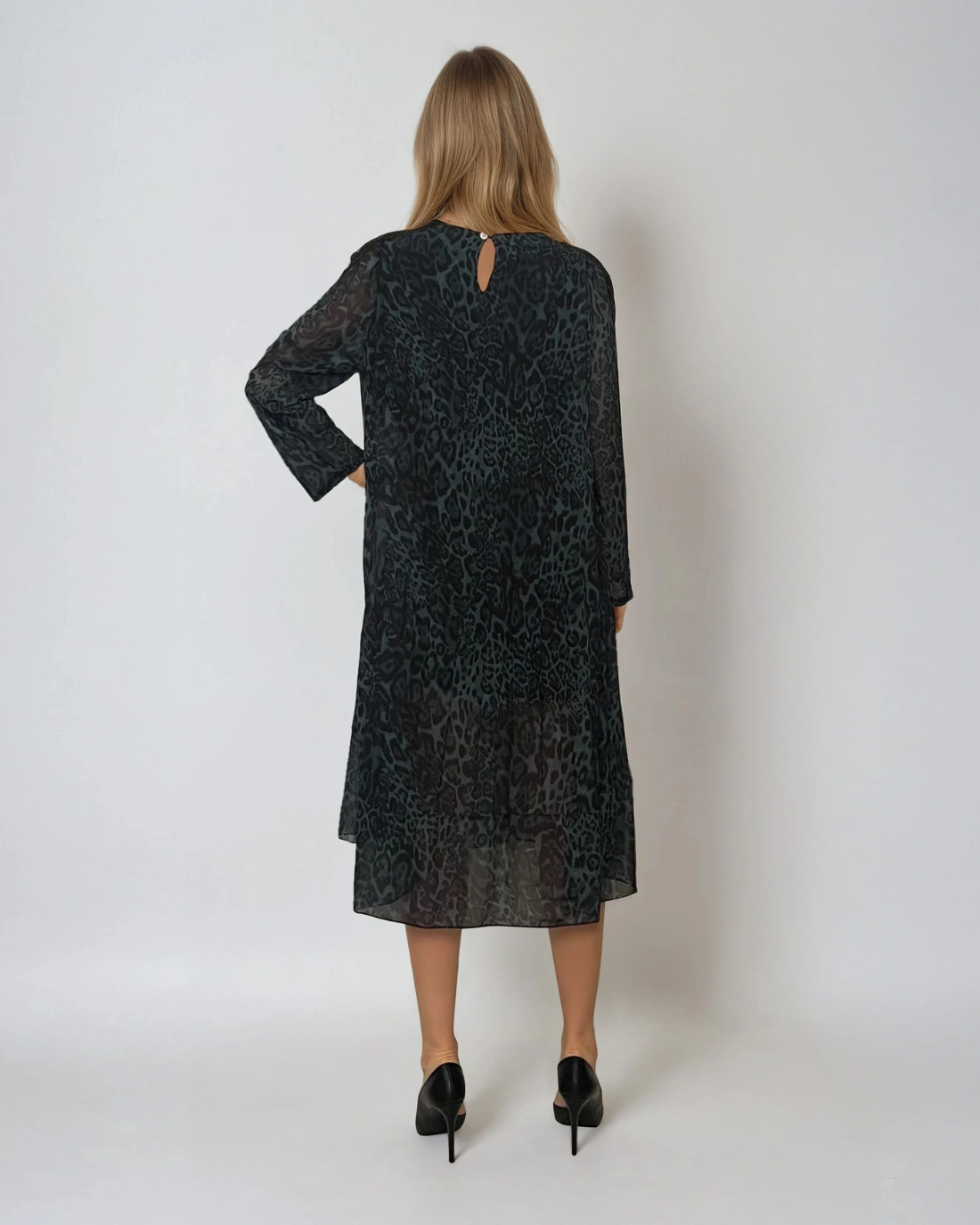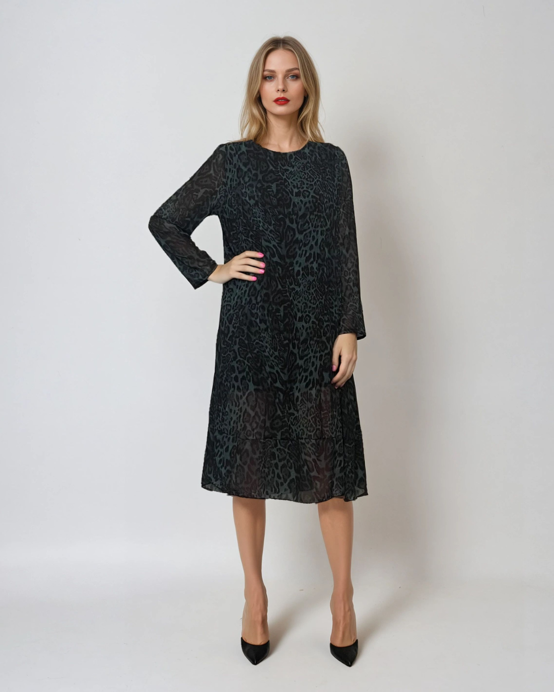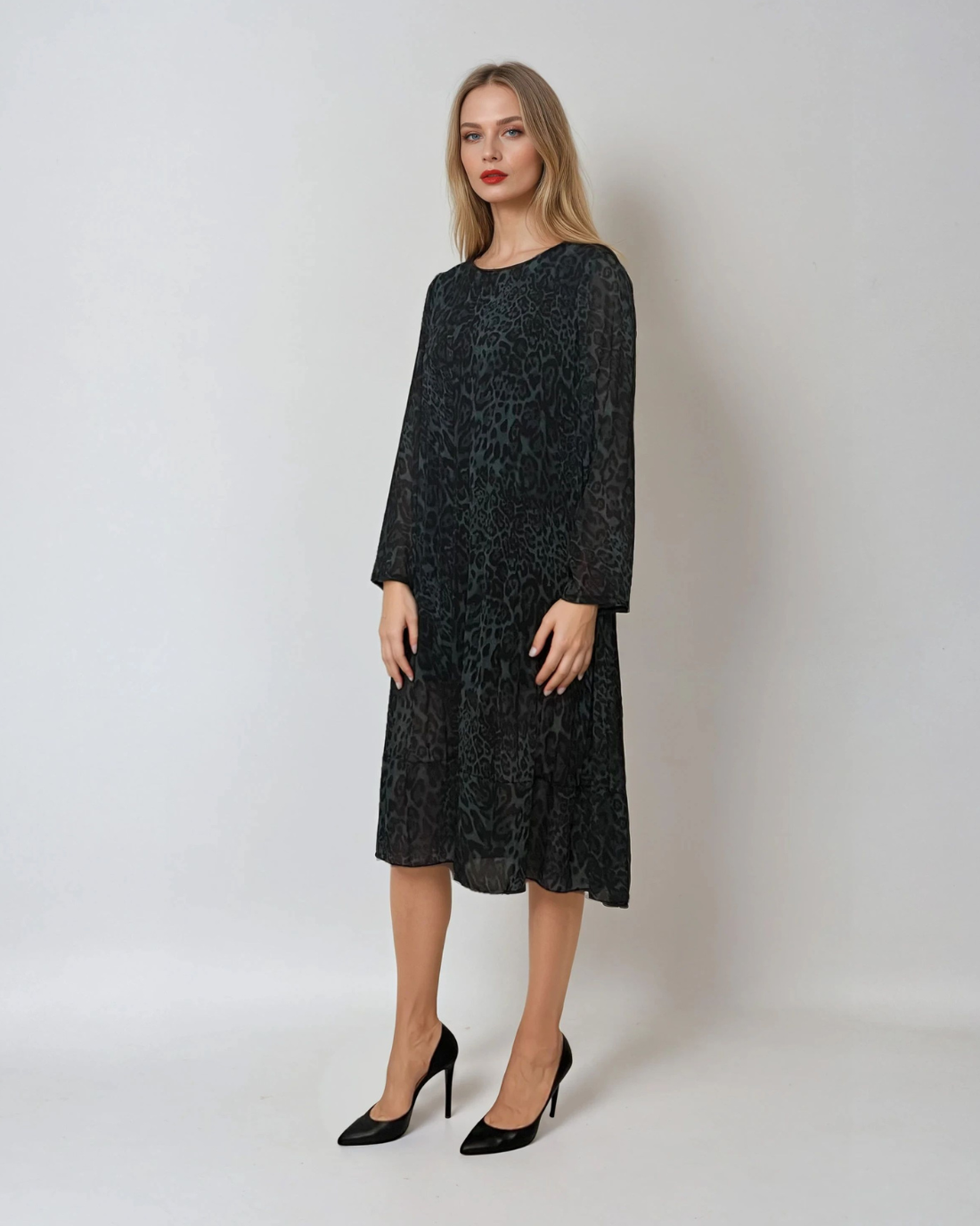 Rochie midi cu mânecă lungă și animal print verde, o piesă versatilă, potrivită atât pentru ținutele de zi, cât și pentru cele de seară, în funcție de accesorizare. Croiala largă oferă confort și libertate de mișcare, iar materialul ușor și plăcut la atingere asigură un look elegant și modern.