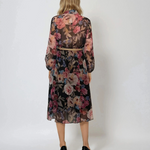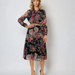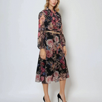 Rochie midi neagră din voal cu print floral elegant, ideală pentru evenimente de seară sau ceremonii speciale. Curea inclusă evidențiază talia, iar esarfele din zona gâtului pot fi lăsate libere sau legate în fundă pentru un plus de stil.