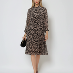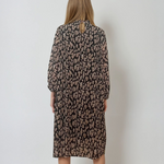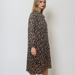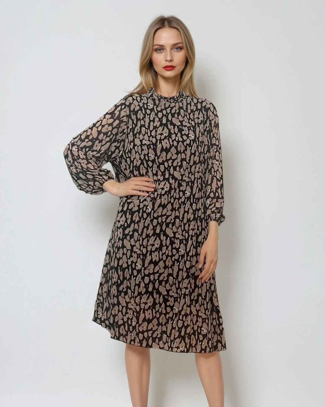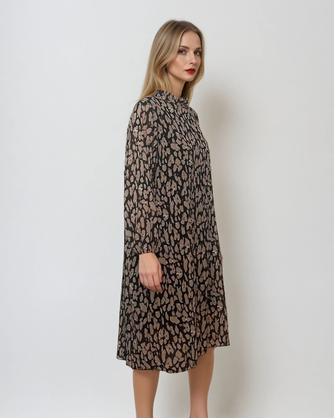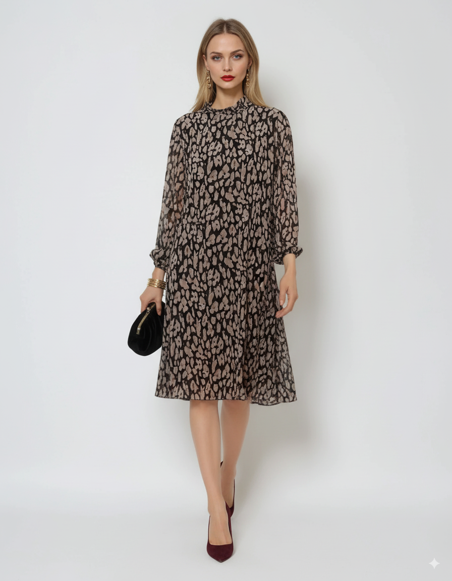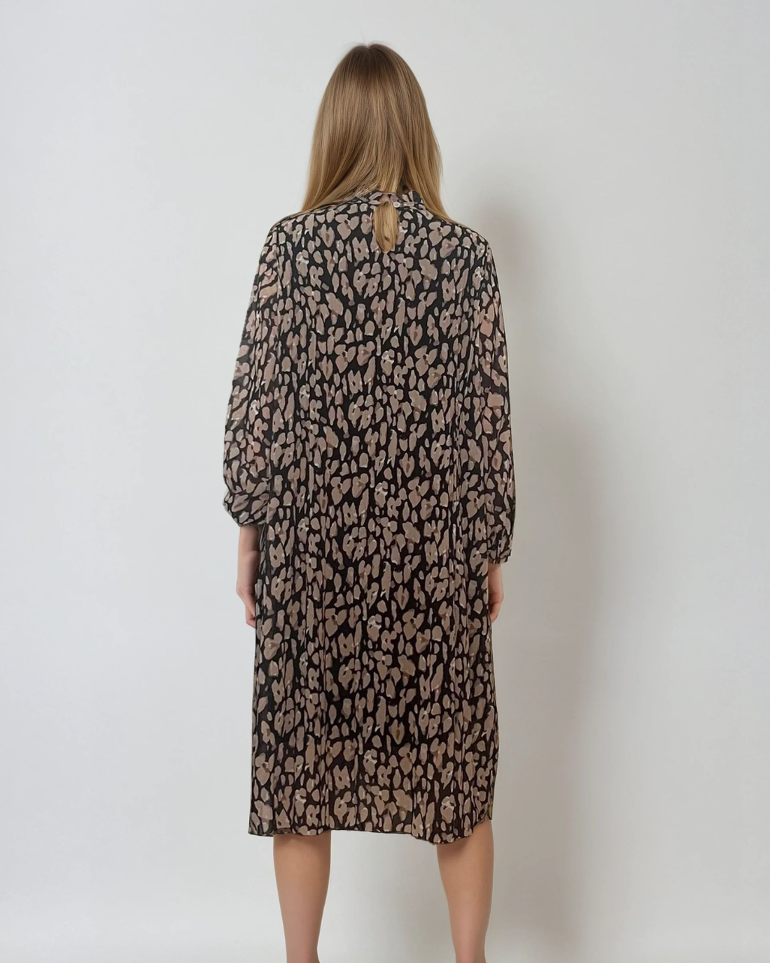 Rochie midi lejeră cu guler și animal print beige, realizată din material ușor cu 50% vâscoză. Designul cu mâneci lungi și elastic la manșete oferă un echilibru între confort și rafinament. Croiala largă, gulerul pe gât și imprimeul discret o transformă într-o piesă elegantă, ideală pentru ținute de zi sau evenimente informale.