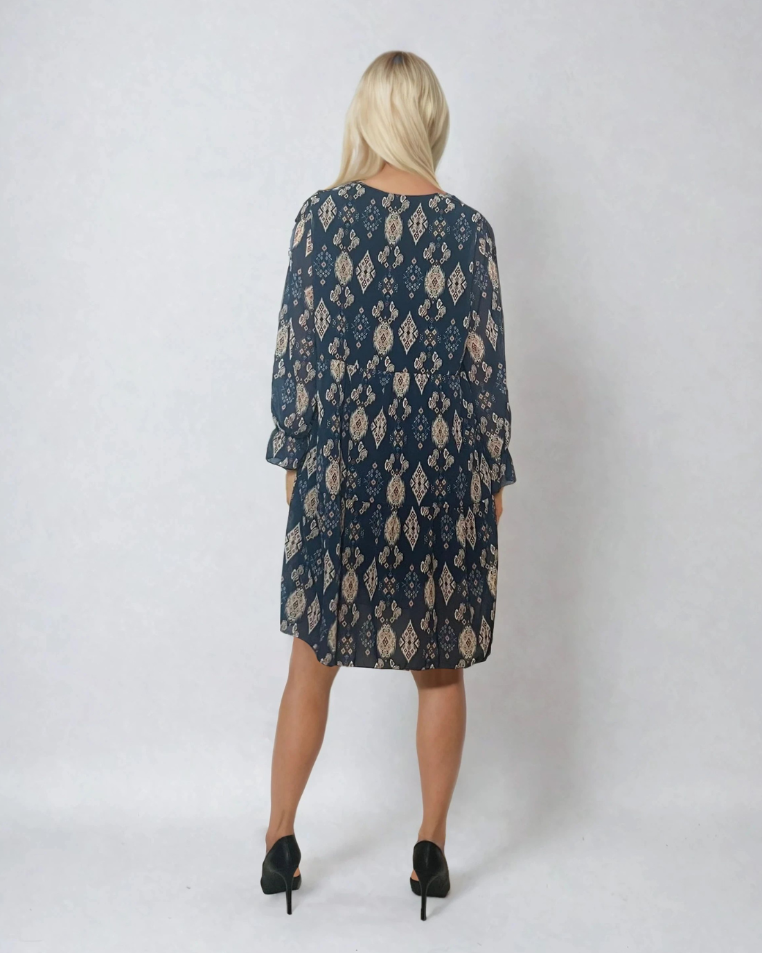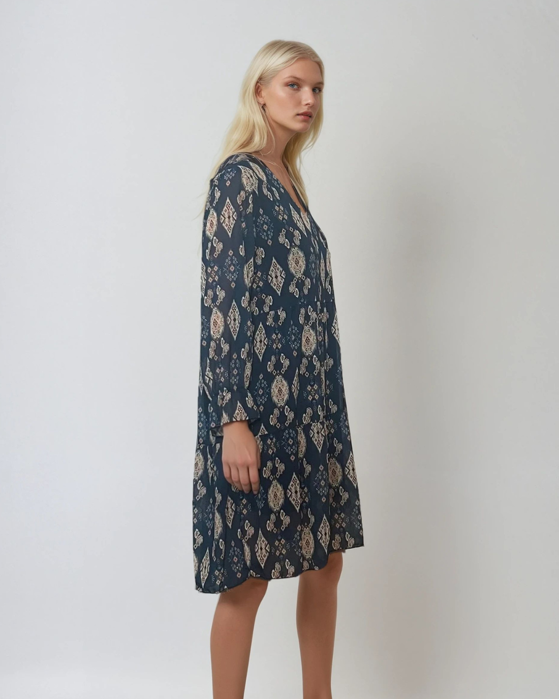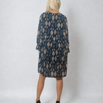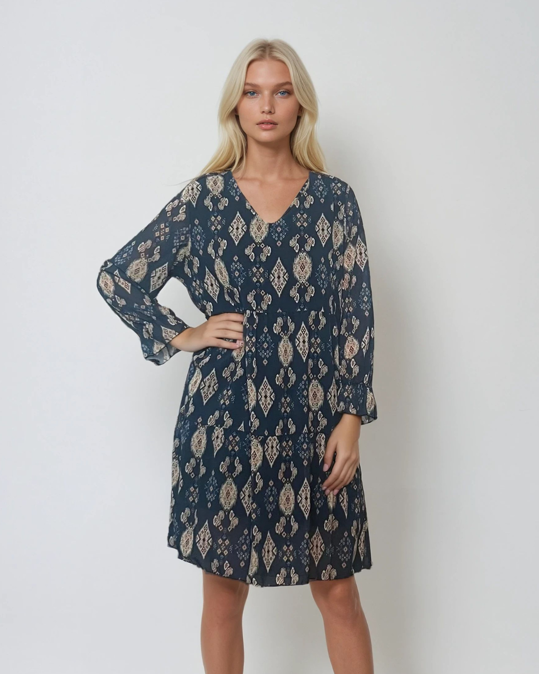 Rochie midi lejeră cu print și decolteu în V albastră combină confortul cu un design atrăgător. Țesătura fluidă cu 50% vâscoză se așază frumos pe corp, iar croiala lejeră avantajează siluete diverse. Mâneca lungă cu detaliu decorativ și imprimeul subtil creează un look feminin și ușor sofisticat.