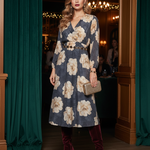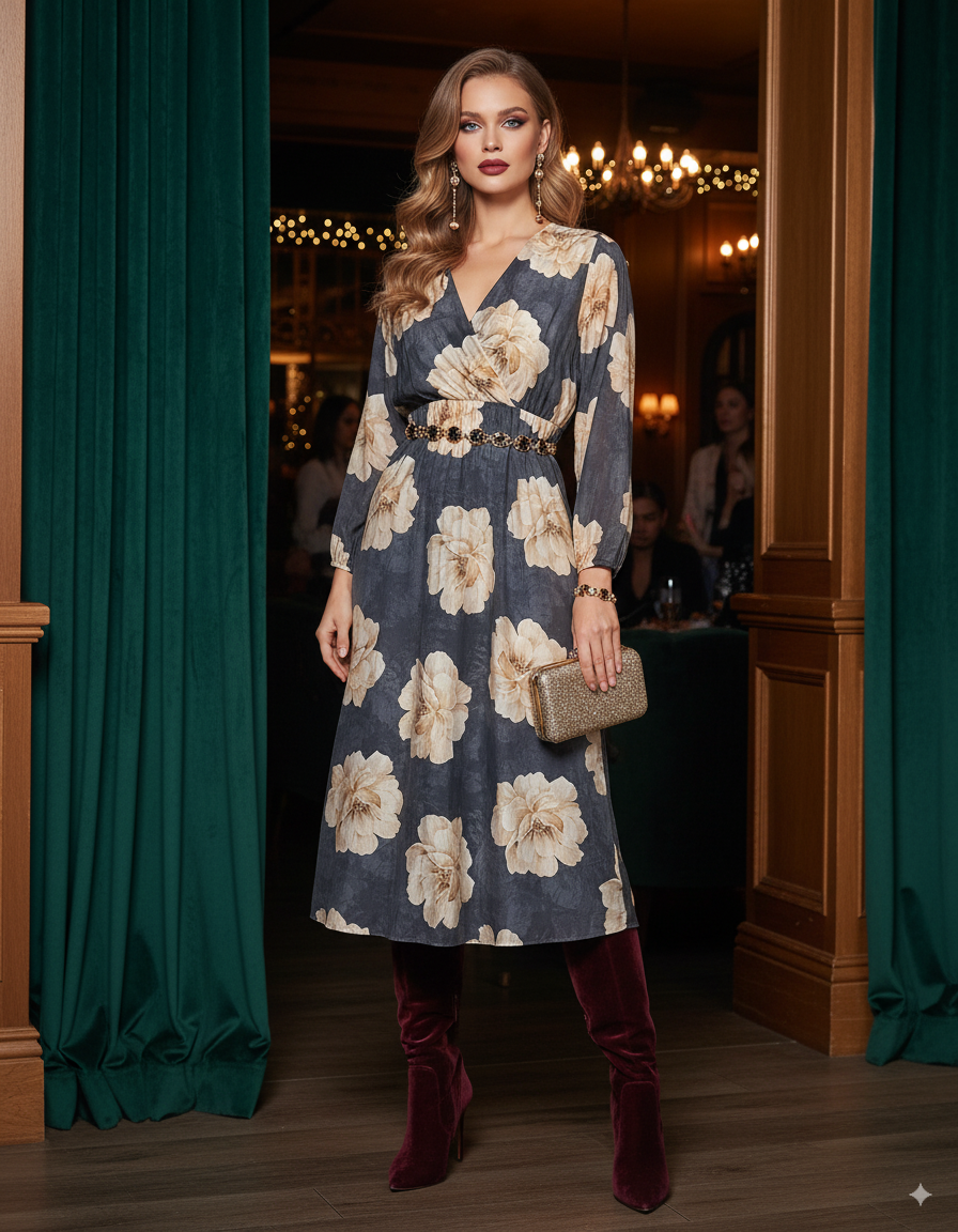 Rochie lungă cu print floral, mânecă lungă, elastic talie, decolteu în V bleumarin