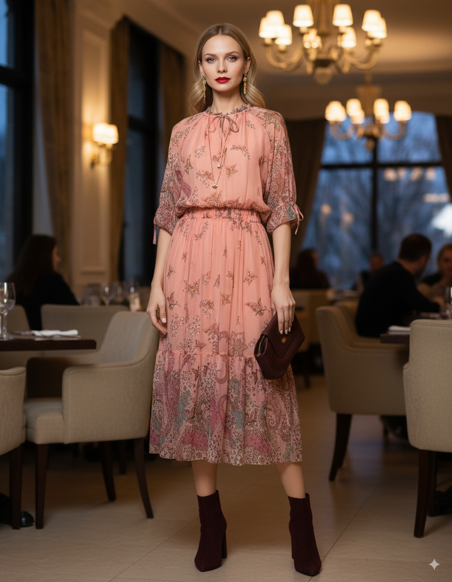Rochie lungă roz din voal fluid cu volan jos și print floral delicat, perfectă pentru apariții feminine și elegante la ocazii speciale. Materialul căptușit cu vâscoză asigură o purtare confortabilă, iar mânecile bufante cu elastic adaugă un plus de stil.