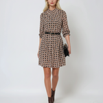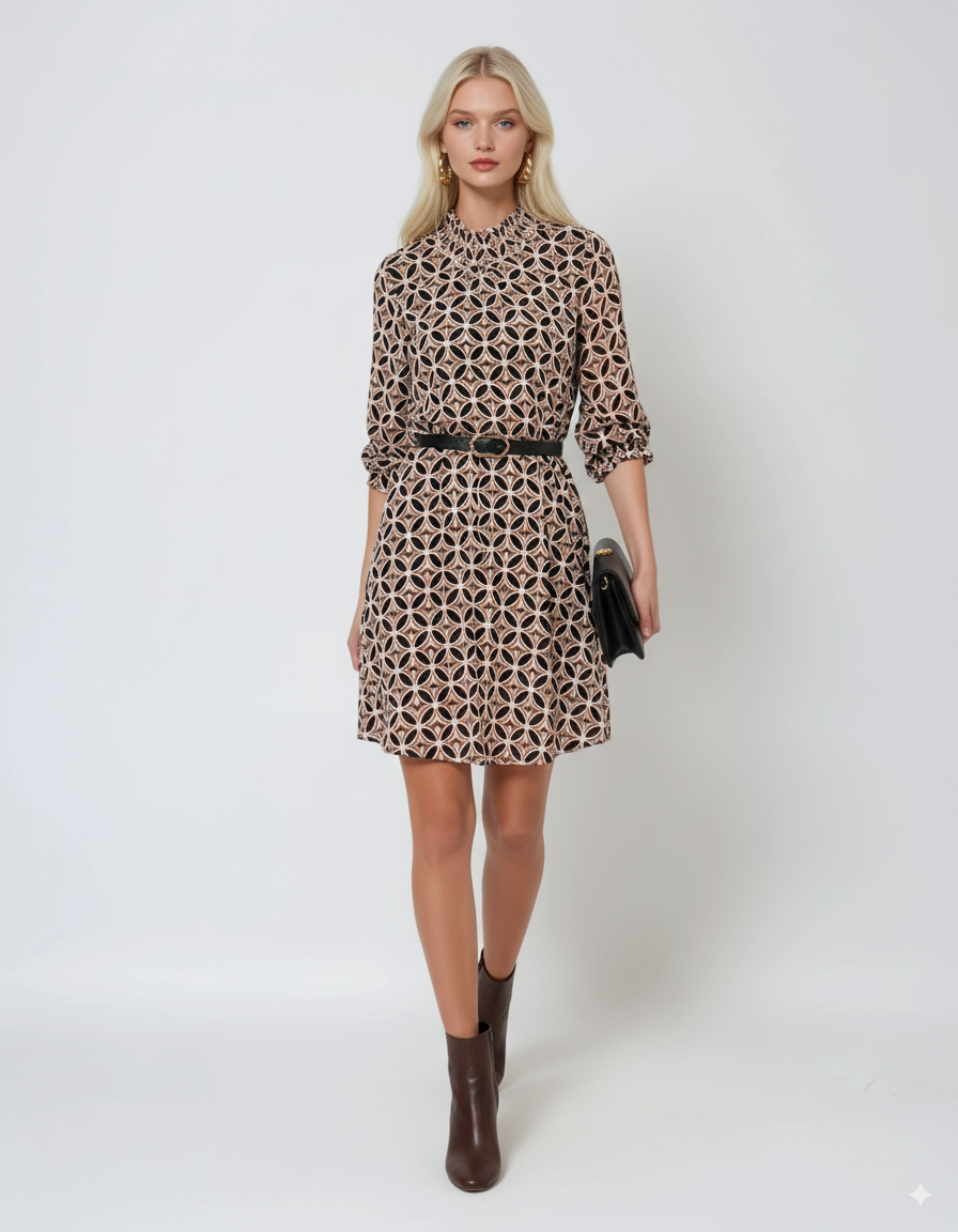 Rochie scurtă cu print geometric și guler lejer beige, o piesă feminină și elegantă, cu o croială lejeră dar bine conturată datorită elasticului din talie. Designul cu mâneci lungi și guler discret pe gât accentuează rafinamentul, iar materialul cu 50% vâscoză oferă fluiditate și confort la purtare.