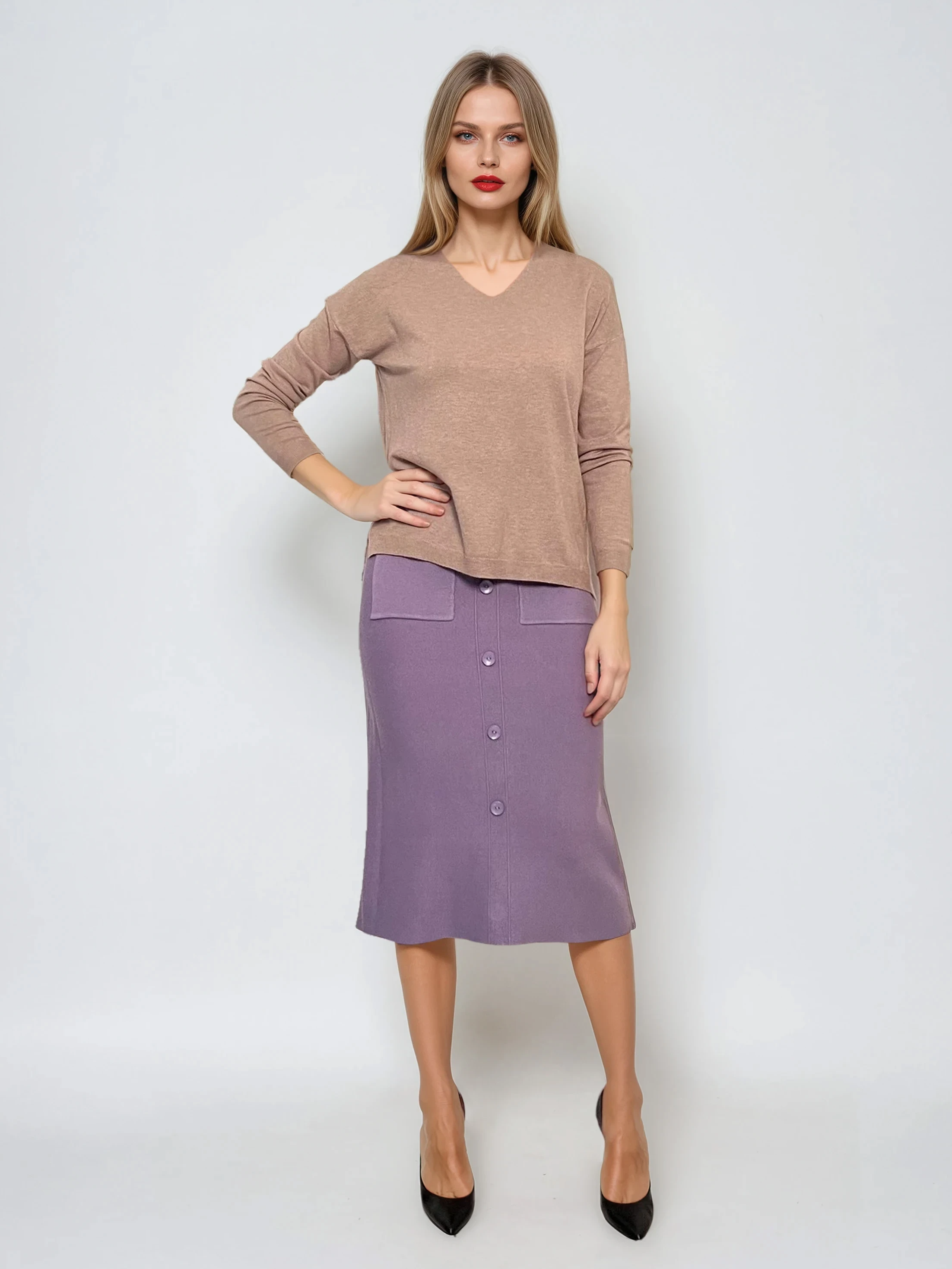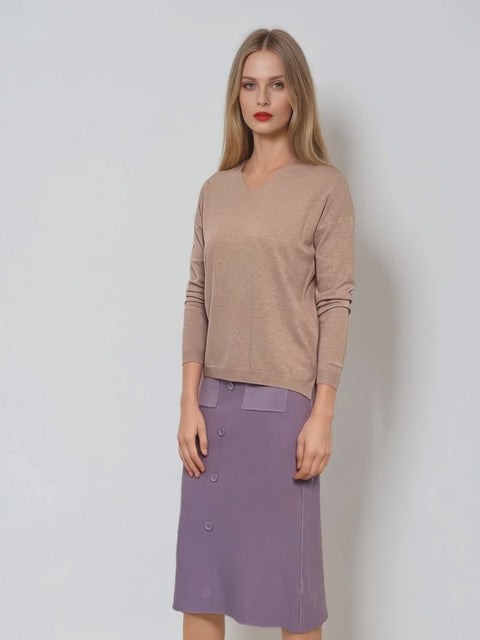 Pulover cu en cœur și mânecă lungă beige, perfect pentru un stil discret și elegant. Tonul cald adaugă luminozitate ținutelor de zi, iar decolteul subtil evidențiază linia gâtului. Potrivit pentru birou sau cafele în oraș.