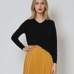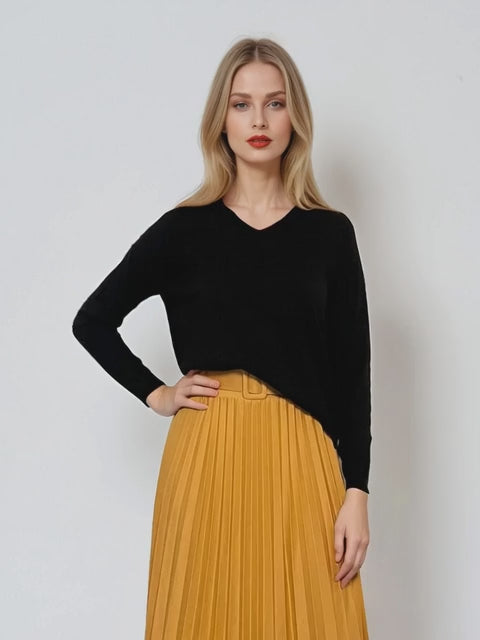 Pulover cu en cœur și mânecă lungă negru, o piesă esențială pentru garderoba de toamnă-iarnă. Designul simplu cu decolteu subtil adaugă feminitate, iar nuanța clasică îl face ideal pentru combinații versatile, de la office la casual.