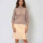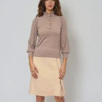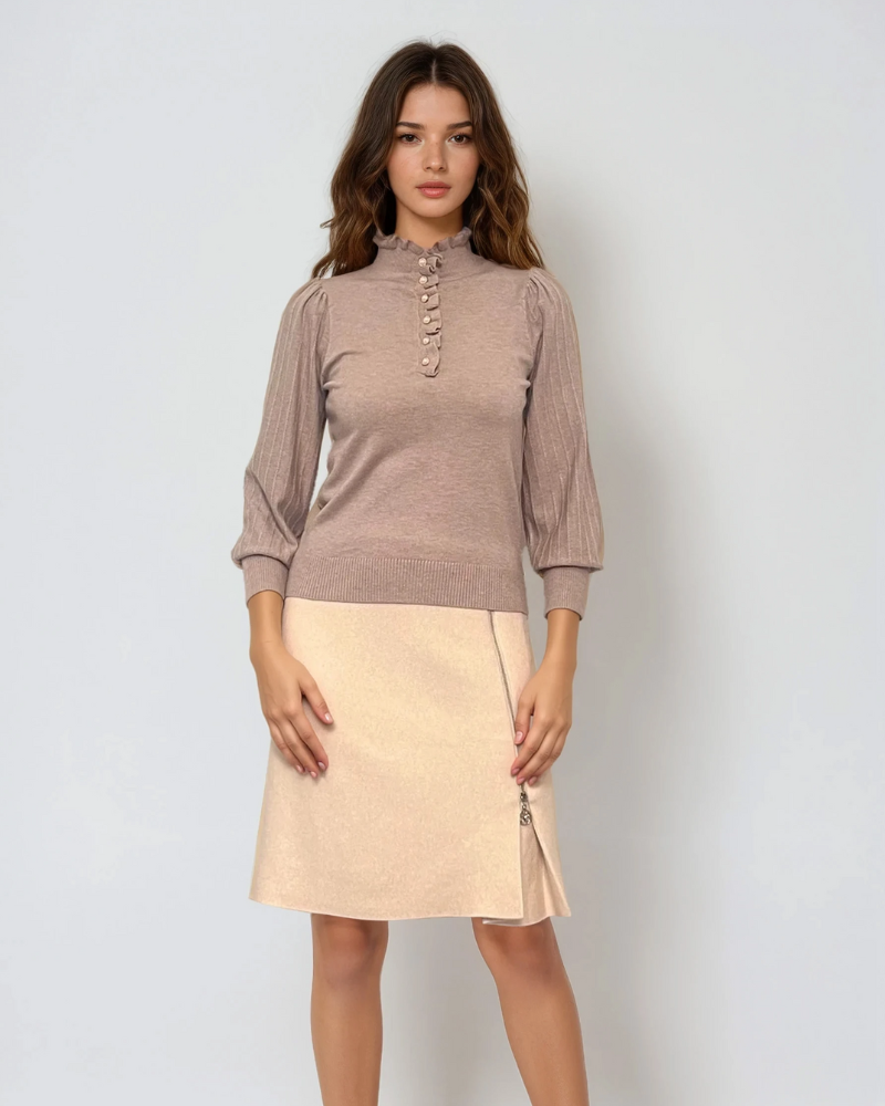 Pulover cu mâneci bufante și guler încrețit beige este o alegere rafinată și ușor de integrat în orice ținută. Culoarea neutră și detaliile fine oferă un look minimalist și elegant, ideal pentru birou sau ieșiri casual.