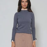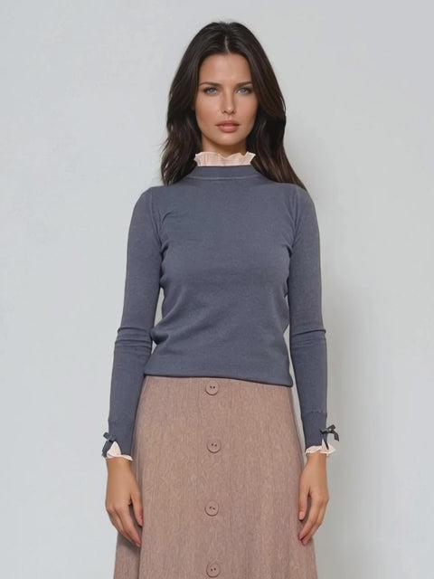 Pulover cu volan plisat la mânecă și gât albastru, o alegere delicată pentru un look proaspăt și feminin. Nuanța vibrantă aduce un aer tineresc, iar volanul adaugă un plus de eleganță. Se potrivește perfect pentru birou sau ieșiri în oraș.
