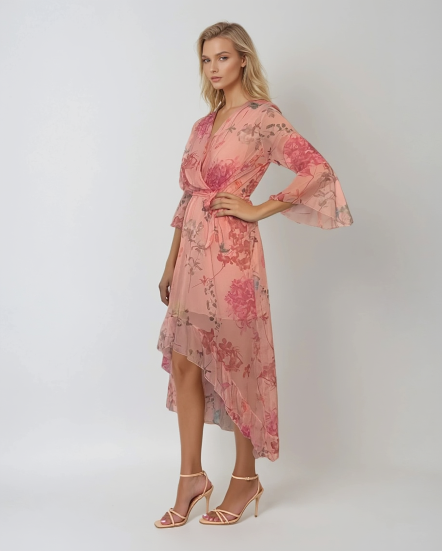 Rochie asimetrică roz din voal cu print floral pastel, feminină și diafană, ideală pentru petreceri de zi sau evenimente în aer liber. Mânecile 3/4 tip clopot și croiala fluidă conferă lejeritate și stil, iar cordonul marchează talia cu finețe.