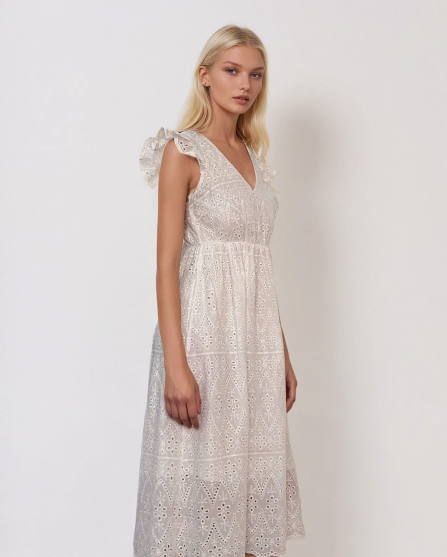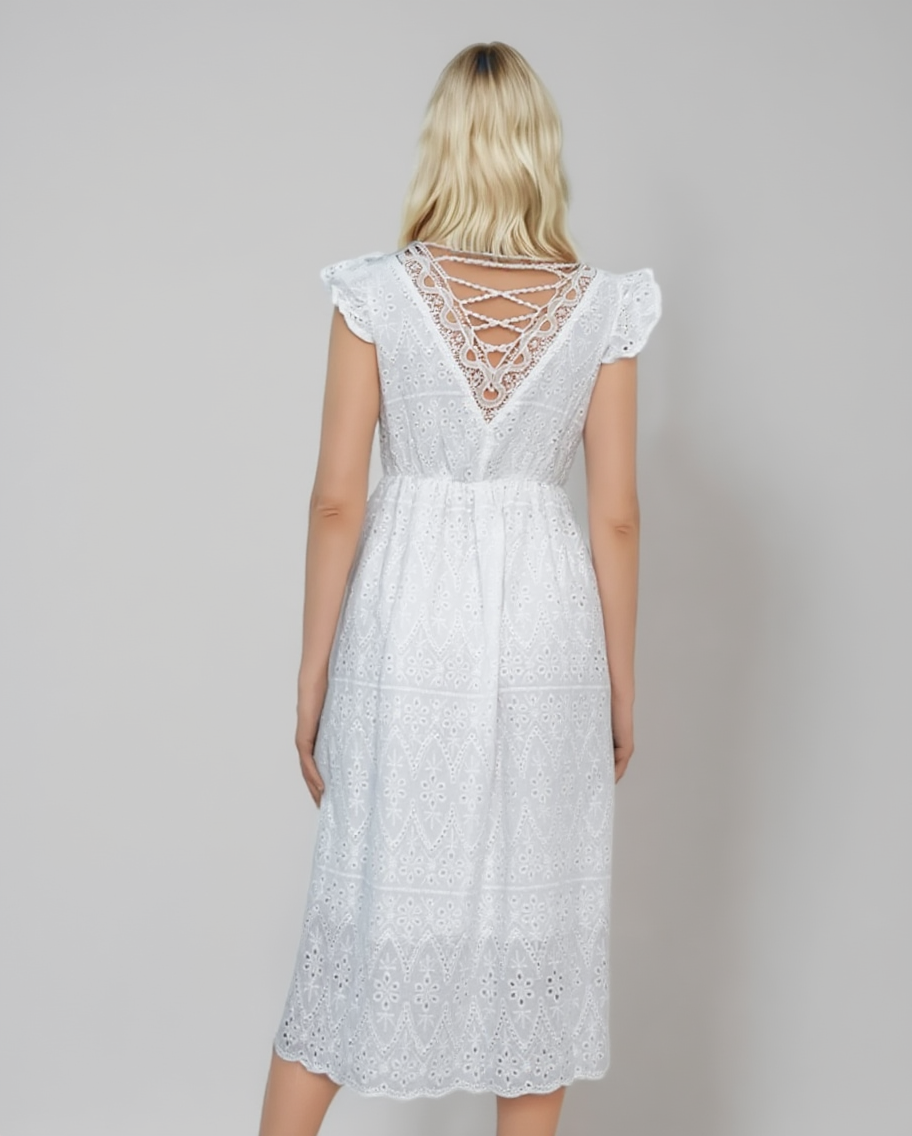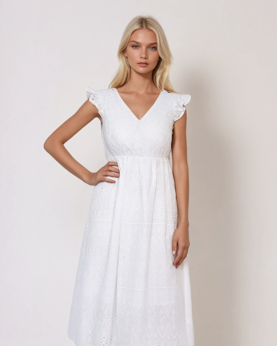 Rochie brodată cu decolteu în V și elastic în talie alb este o alegere elegantă și lejeră pentru zilele de vară sau evenimente în aer liber. Broderia delicată și decolteul în V creează un look romantic, iar talia elastică subliniază subtil silueta fără a compromite confortul.
