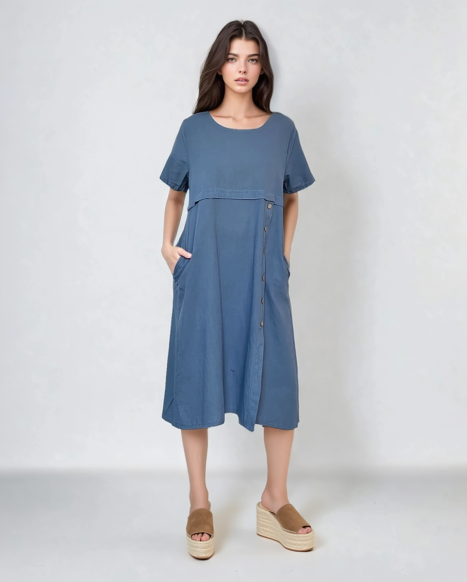 Rochie cu buzunare și nasturi pe o parte albastru jeans aduce o notă urbană și relaxată în garderoba ta. Nuanța inspirată de denim o face ideală pentru purtări zilnice, iar nasturii de pe o parte oferă un detaliu original.