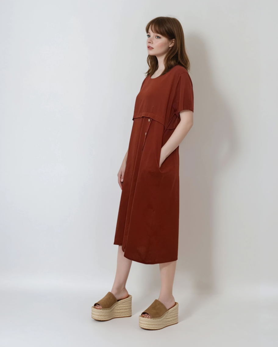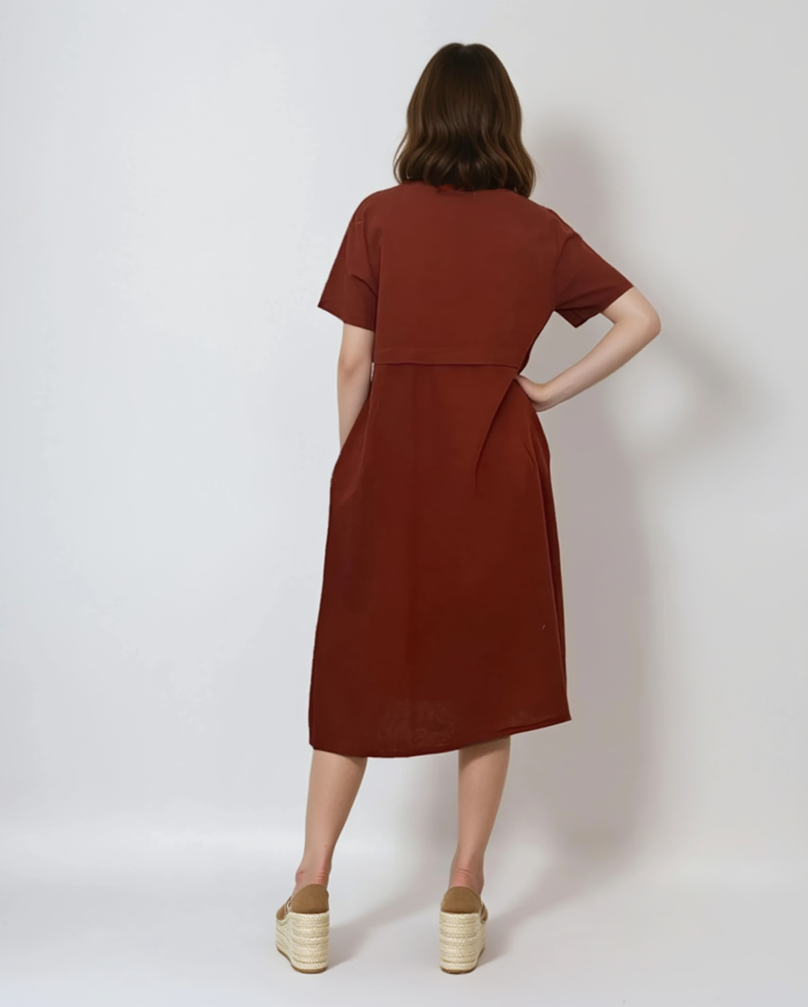 Rochie cu buzunare și nasturi pe o parte cărmiziu este o piesă statement pentru zilele în care vrei să ieși în evidență cu stil. Croiala lejeră și nasturii laterali creează un efect vizual plăcut și modern.