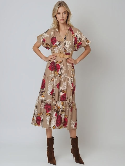 Rochie lunga beige cu volan elegant pe fusta, centura in talie care permite ajustarea si print floral ce ofera un aspect delicat si feminin. Mâneca scurta bufanta adauga un plus de rafinament tinutei.