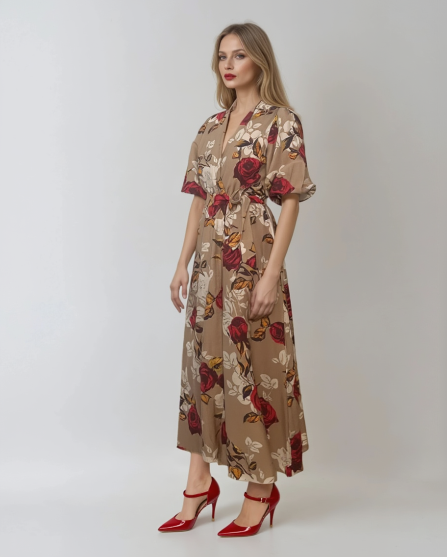 Rochie lunga beige, parte peste parte, cu print floral delicat. Cordonul inclus în talie permite ajustarea croielii pentru un fit perfect, iar mânecile bufante scurte adaugă volum și feminitate.