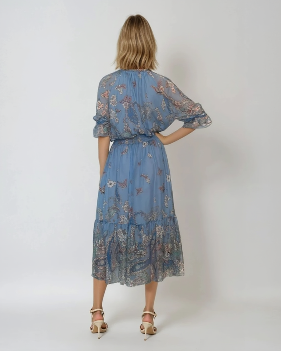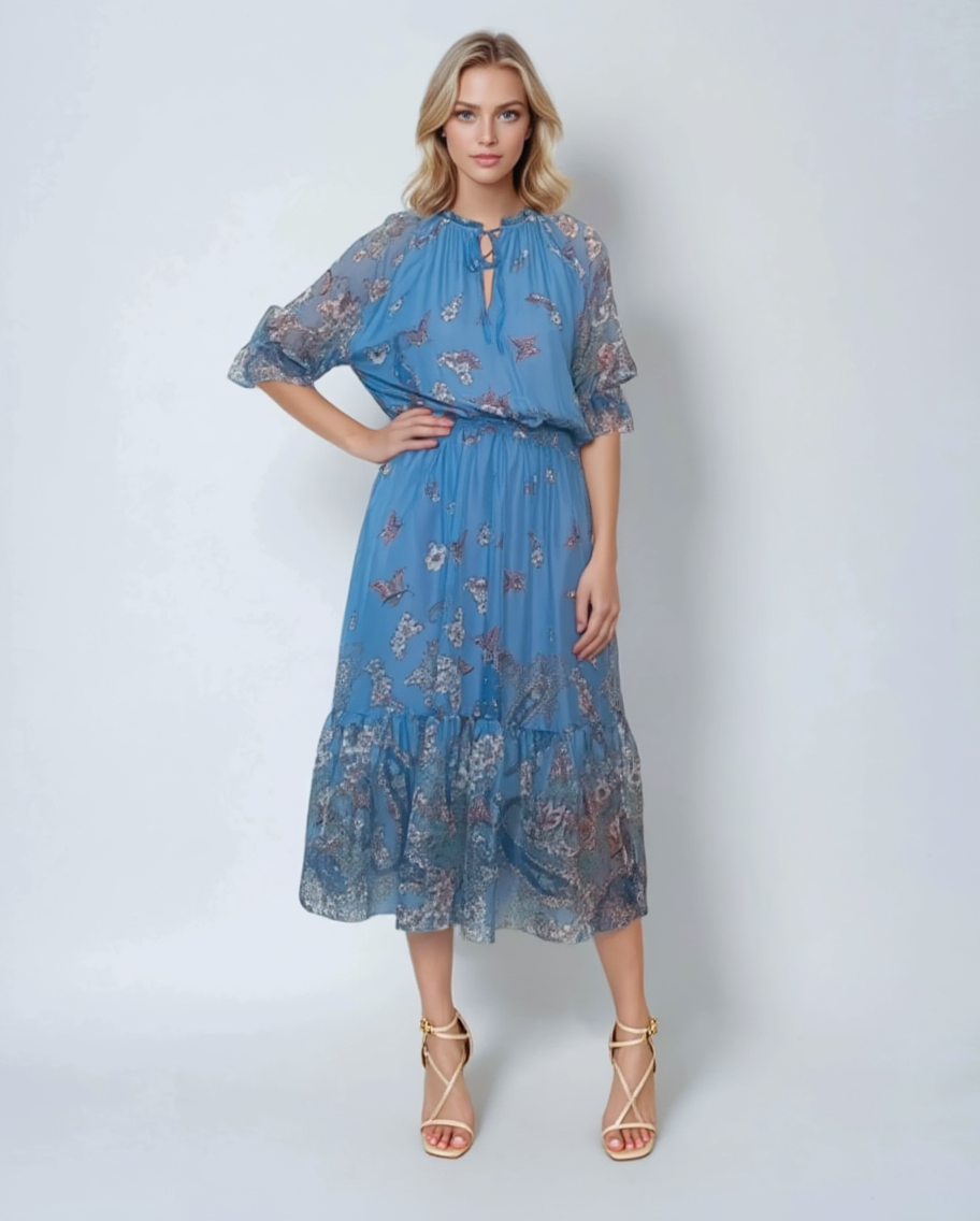 Rochie elegantă din mătase cu volane la umeri bleu